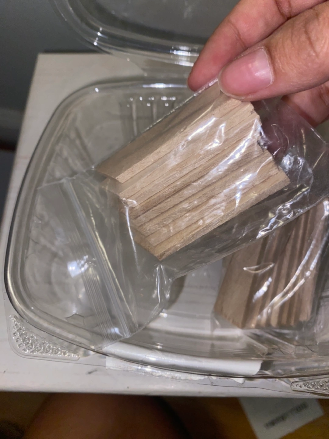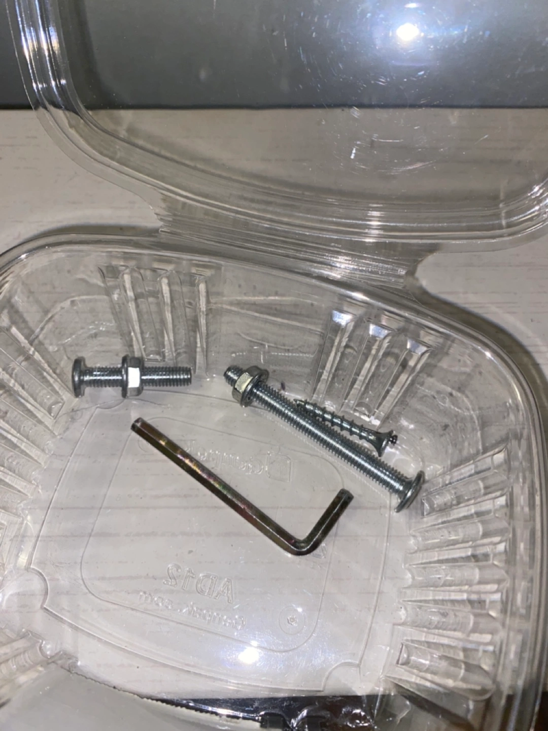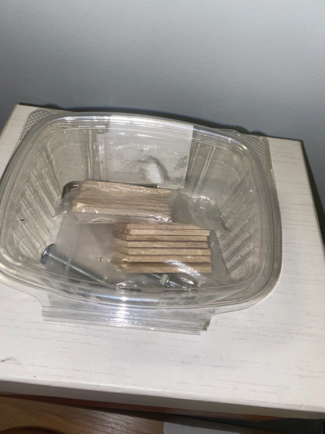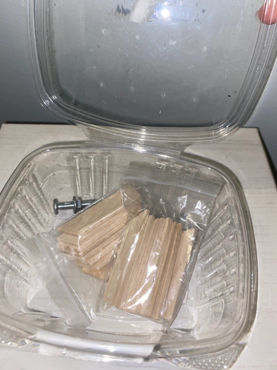 Giving away my life saver for small repairs collection of wood dowels, screws, and an Allen key. They are in a clear plastic container.