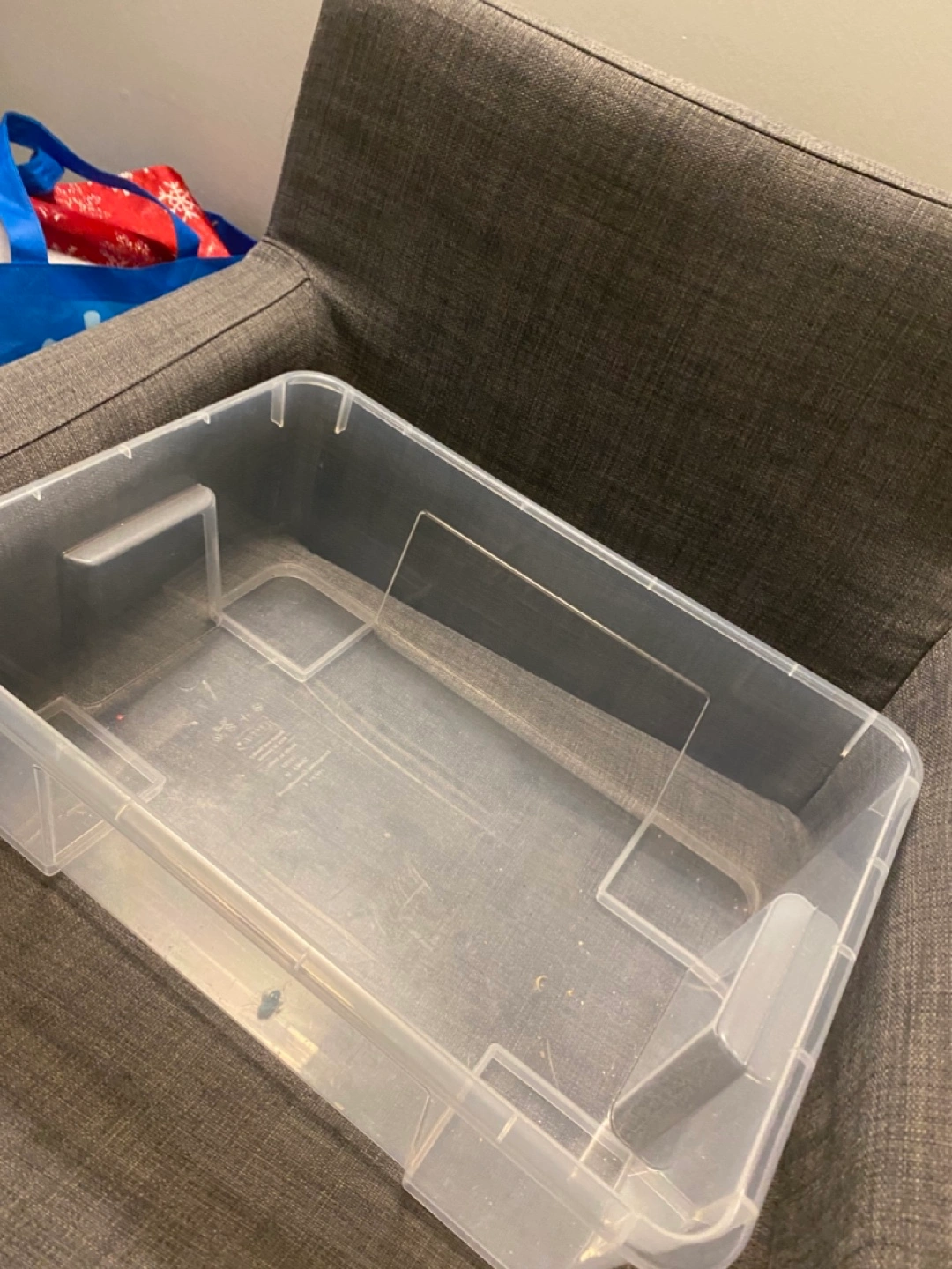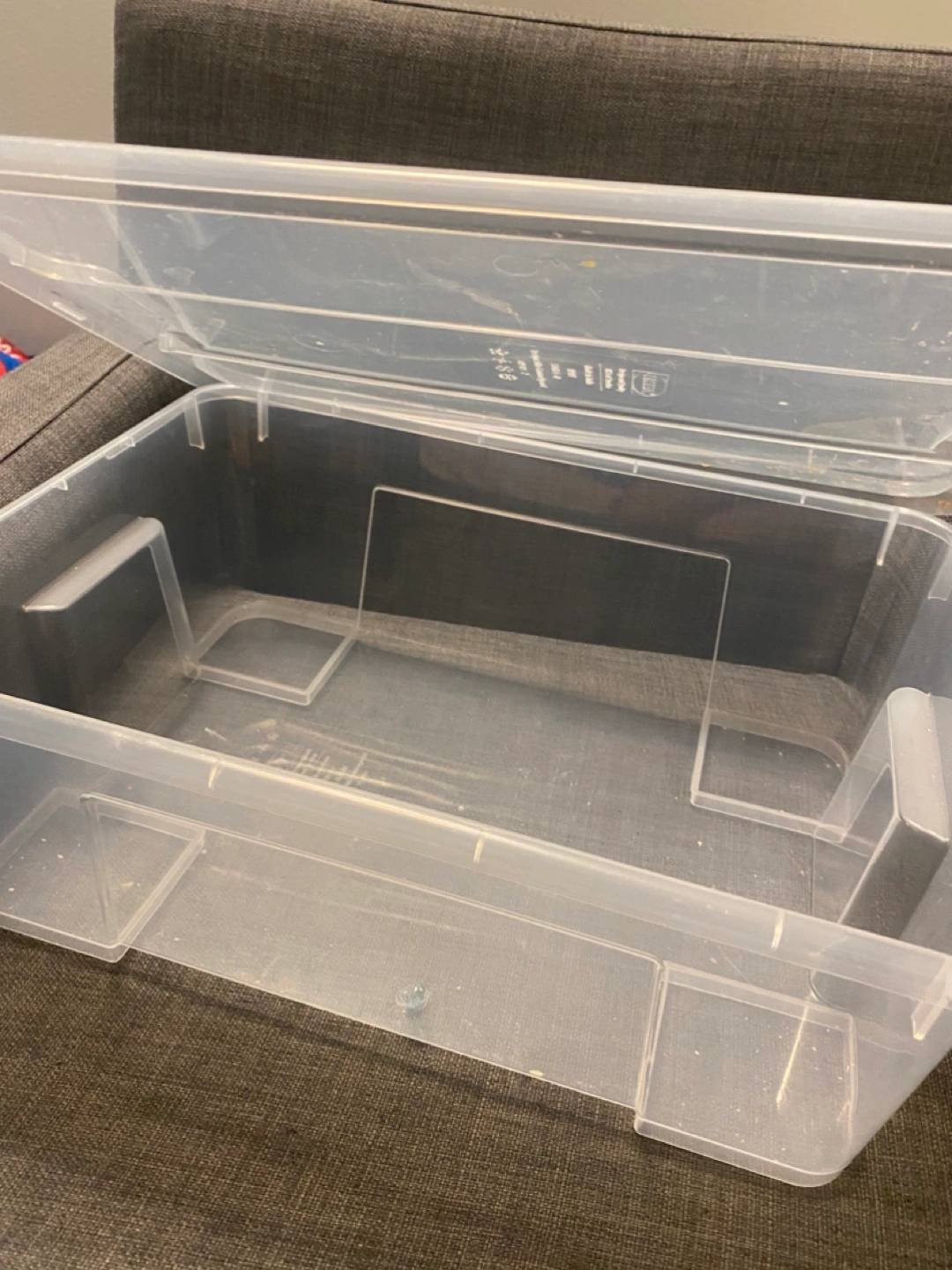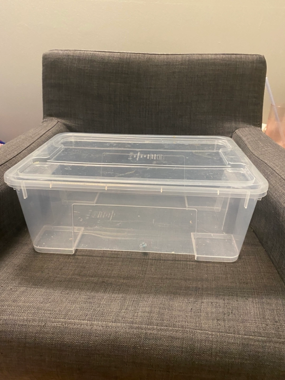 Selling a clear plastic storage container with a lid. It's in great shape and ready to help you organize your stuff! Perfect for storing anything from clothes to toys to household items