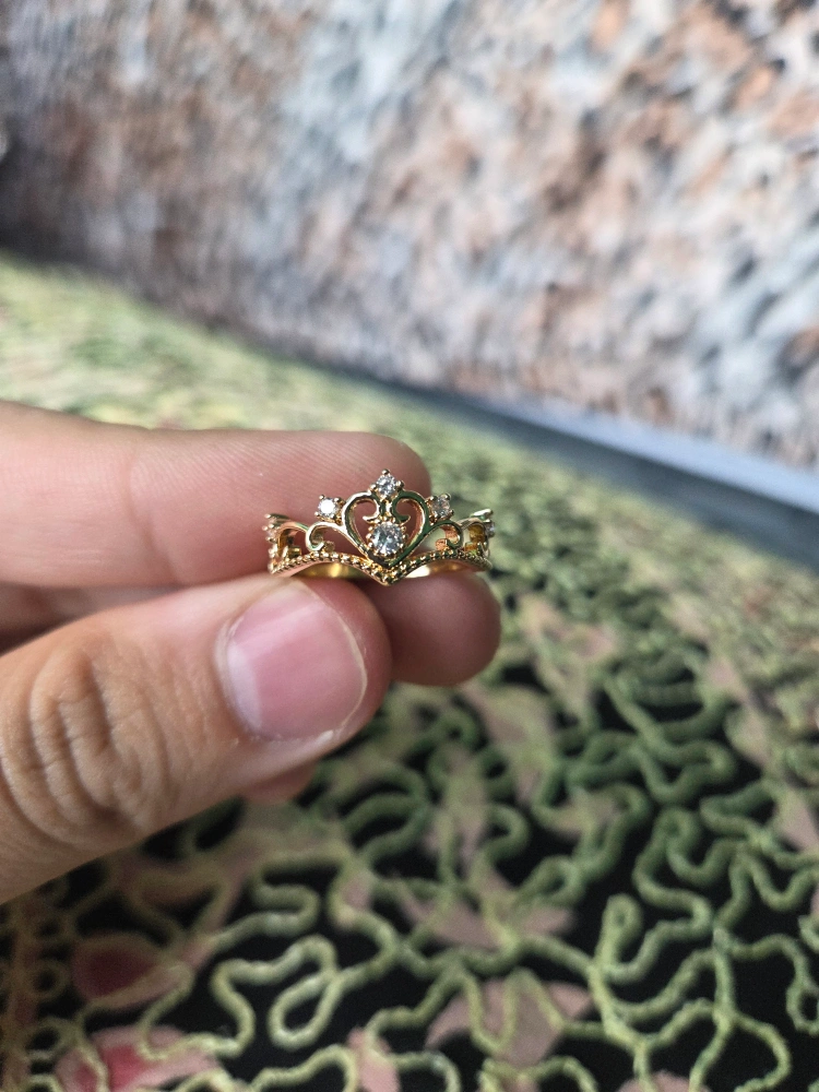 A cute gold-coloured ring shaped like a crown! It has some small stones set in it. Perfect for adding a touch of royalty to your everyday look