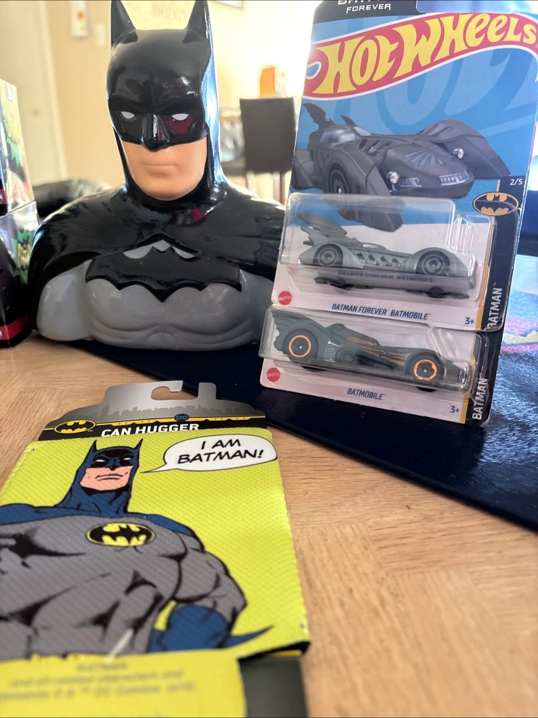 I have a few Batman items for sale: - A Batman can hugger that says "I AM BATMAN!" $5 - A Hot Wheels Batman Forever Batmobile (3+) $20 - A Batman Bank bust $20 Hot wheels $5 each