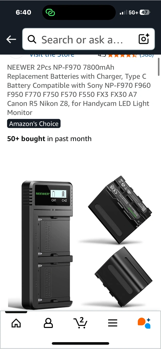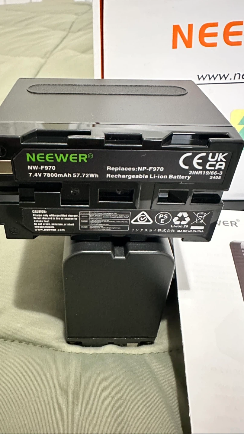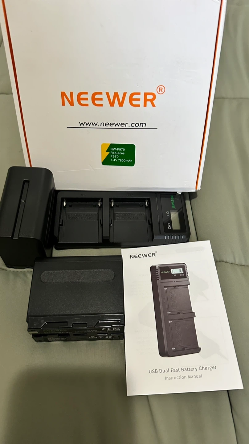 Selling a brand new NEEWER NP-F970 7800mAh battery and charger kit! This kit includes two replacement batteries and a dual USB fast charger. It is compatible with Sony NP-F970, F960, F950, F770, F750, F570, F550, FX3, FX30, A7, Canon R5, Nikon Z8, Handycam, LED Light, and Monitor. The box and instruction manual are included!