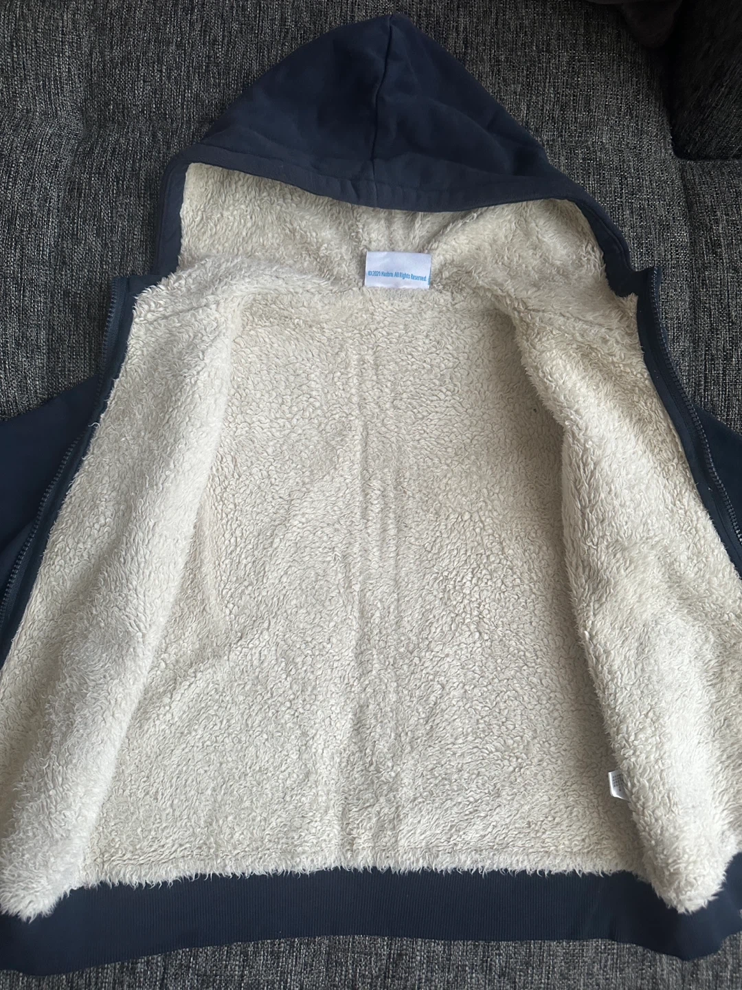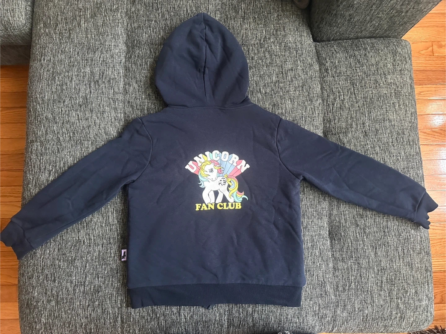 Keep your little one cozy in this adorable navy blue Hurricane Kids Wear fleece-lined hoodie, perfect for those chilly days. Featuring a fun unicorn design on the back and a cute star graphic on the front, this hoodie is both stylish and warm, making it a great addition to any child's wardrobe. It is in perfect condition, for kids 4-7 around 130CM height. * Brand: Hurricane Kids Wear * Colour: Navy Blue * Lining: Fleece * Design: Unicorn and stars * Closure: Zipper See my other listings for more kids' winter clothes, thank you.