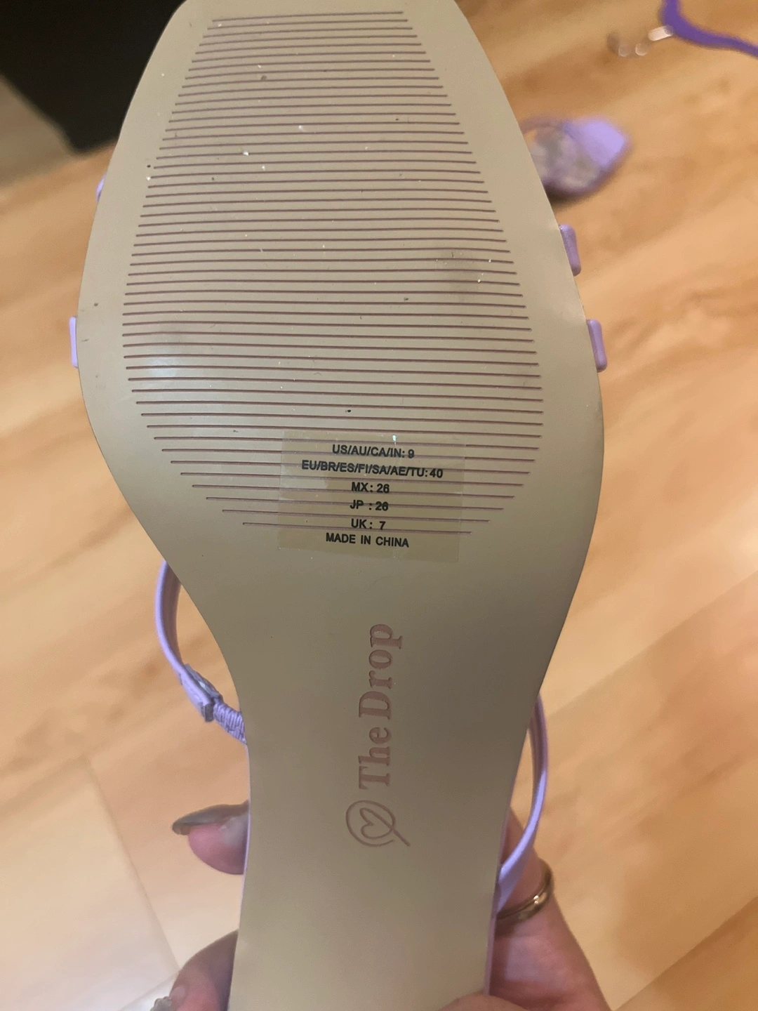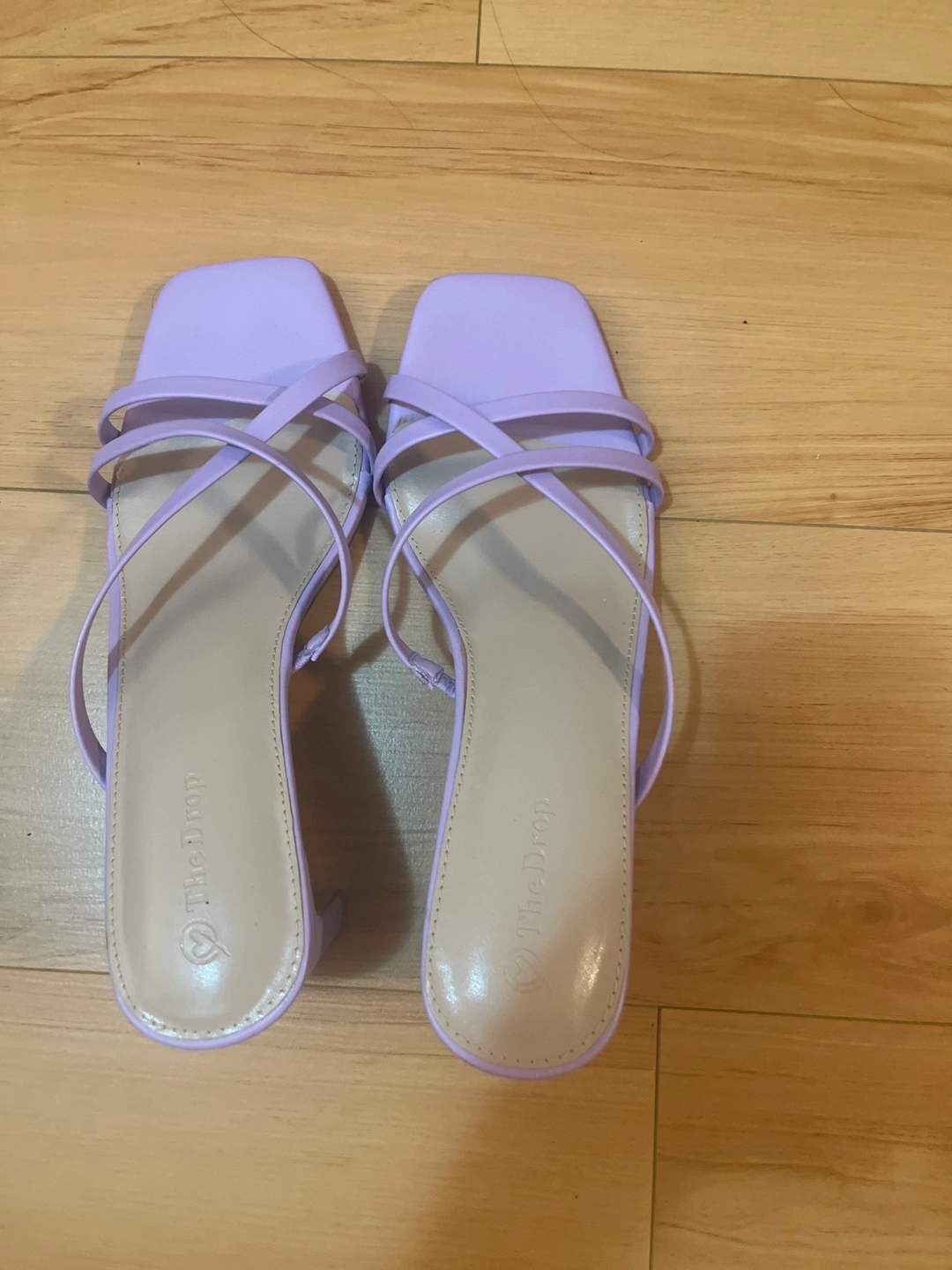 Purple heeled sandals Only worn inside to try on. Ended up not my style. Size 9! Cash preferred!! Selling a pair of The Drop strappy heeled sandals in a lovely light purple colour! They are in excellent condition and are a size 9 (US/CA/IN). The heel height is approximately 3 inches. Perfect for adding a pop of colour to your outfit!