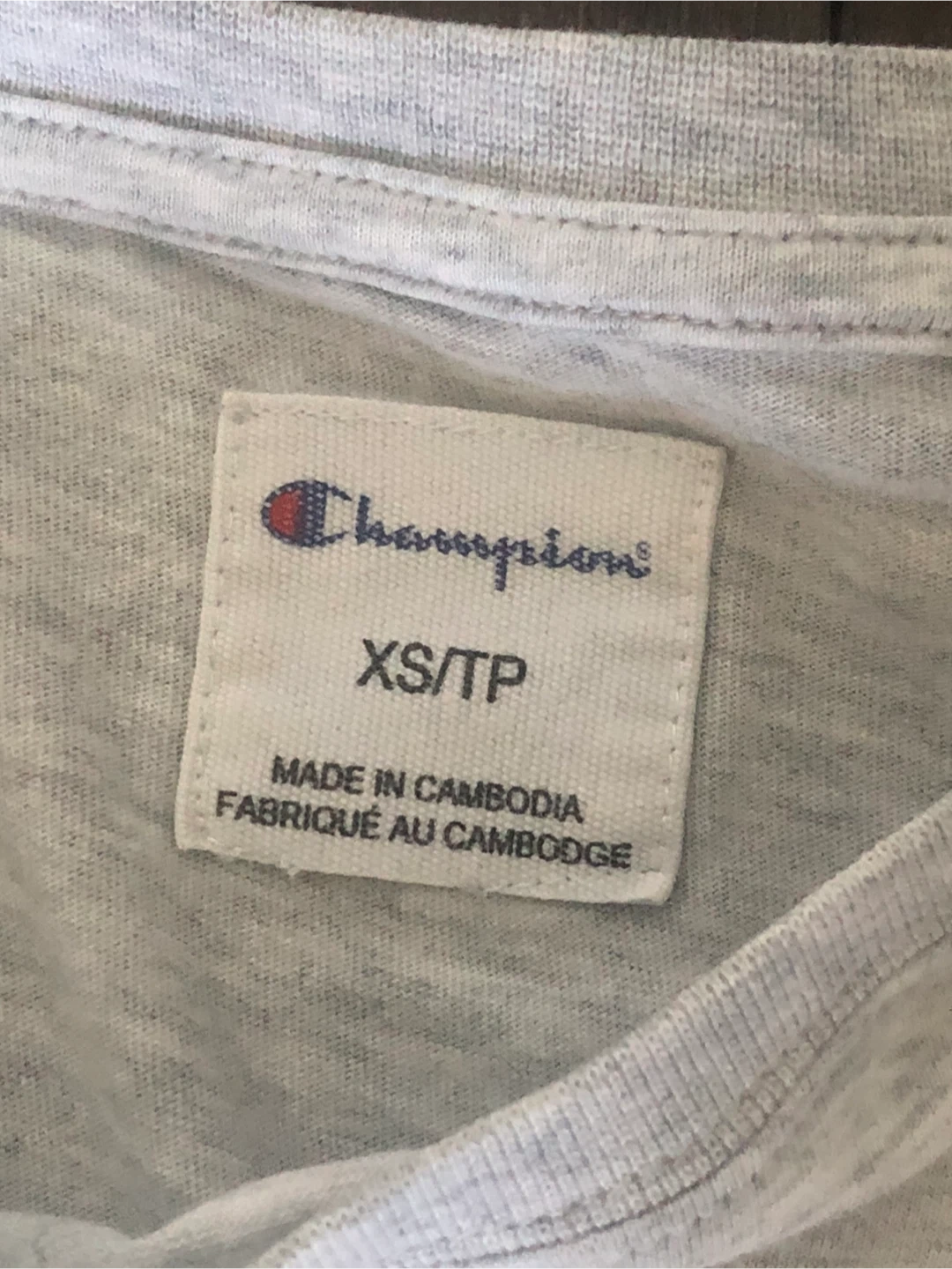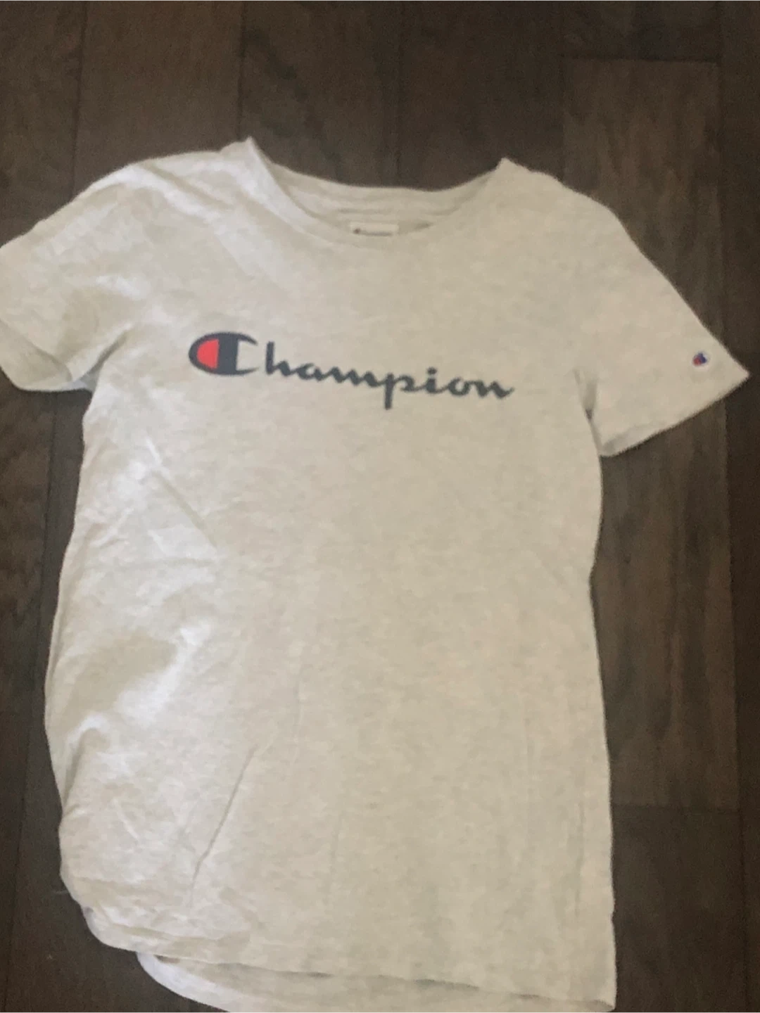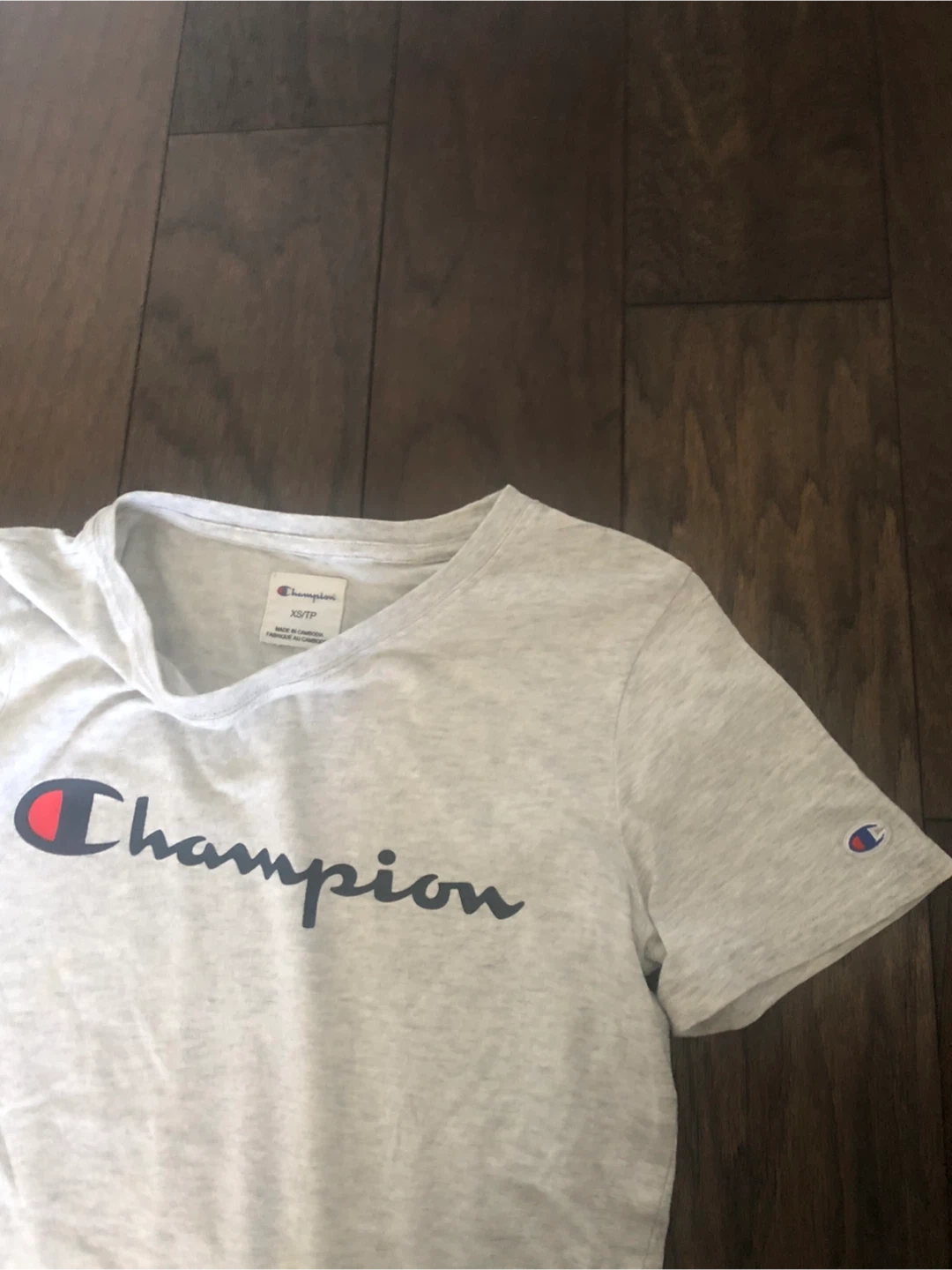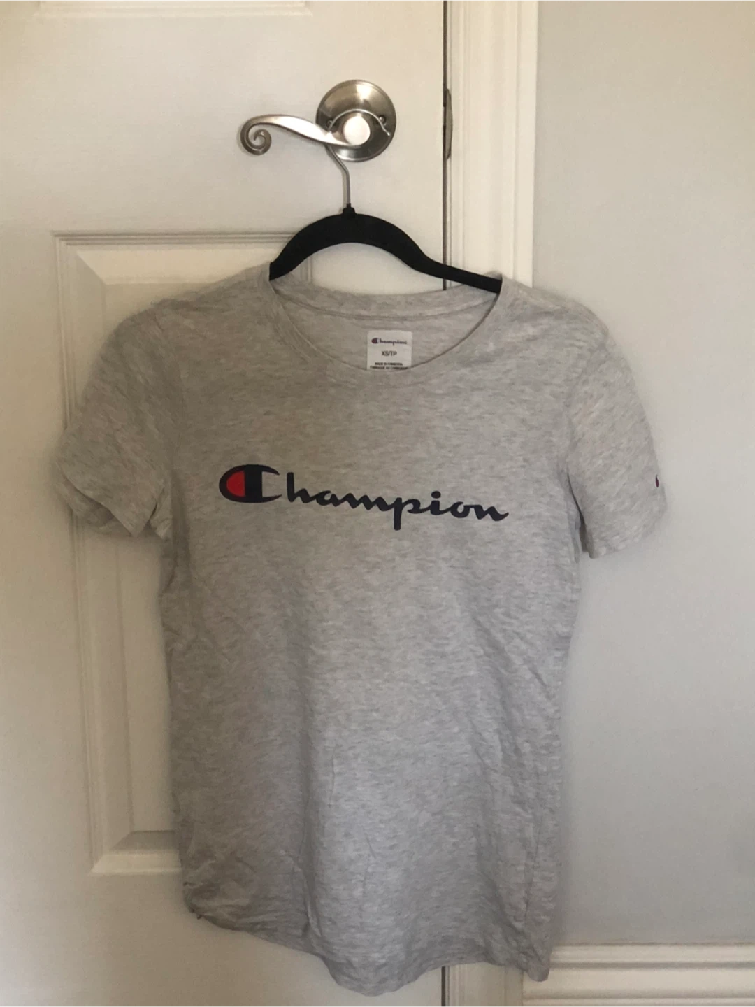 comfy Champion t-shirt in size XS. It's a light grey colour and has the classic Champion logo on the front. Great for casual wear!