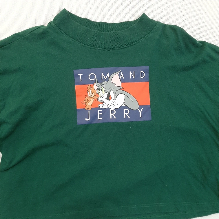 Selling a cute Tom and Jerry crop top! It's a dark green colour and made of 100% cotton. The size is small. It's in great condition and perfect for any fan of the classic cartoon