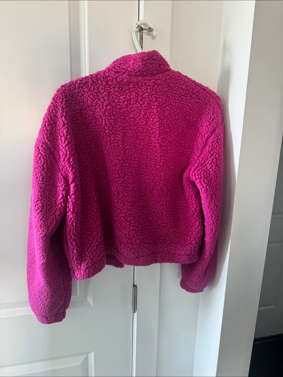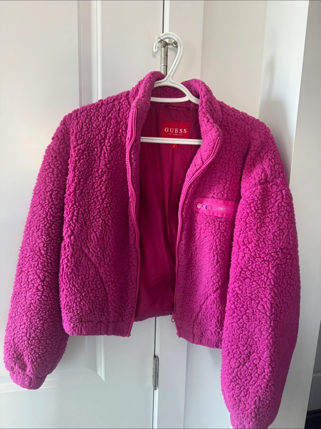 Cozy up in this vibrant pink Guess sherpa jacket! It's a size small and perfect for adding a pop of colour to your wardrobe. The sherpa material is super soft and warm, great for chilly days!