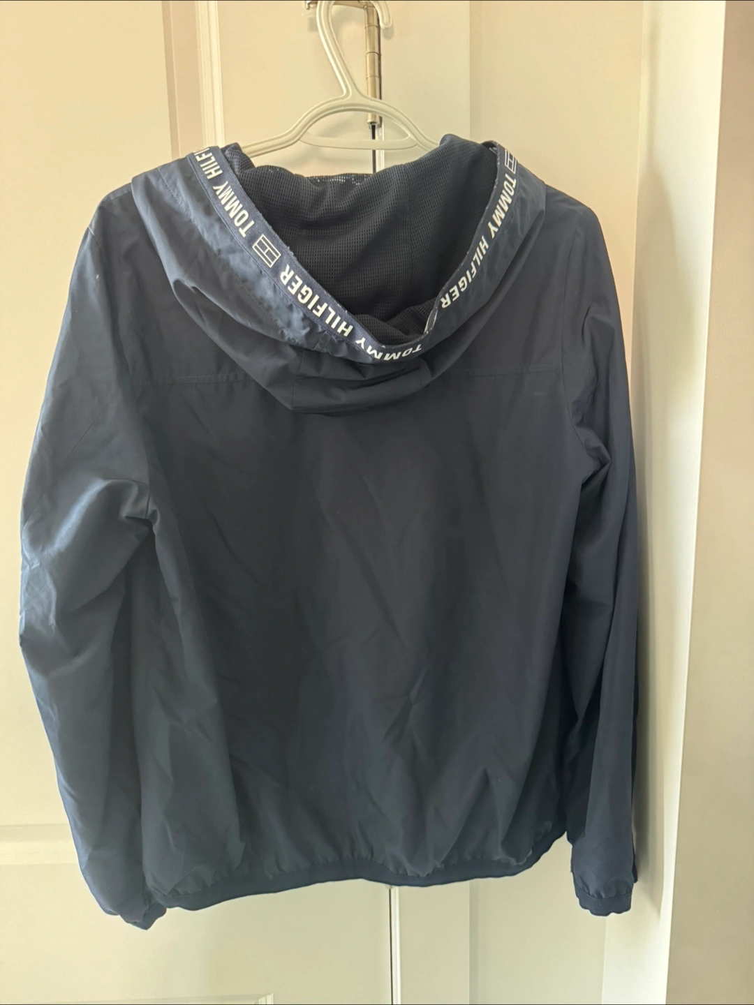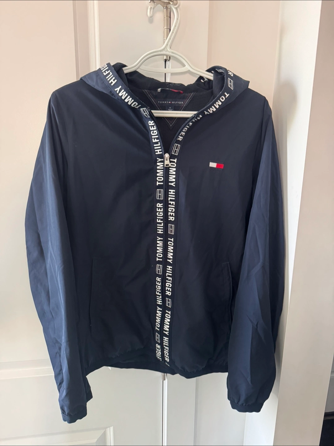 Here's a Tommy Hilfiger windbreaker jacket in a nice navy blue colour! It features the Tommy Hilfiger logo along the zipper and hood. Perfect for those breezy days!
