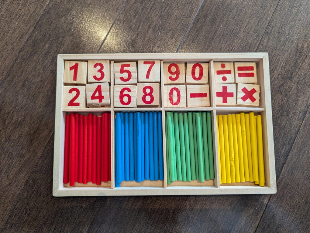 This is a wooden math teaching toy with numbered blocks and counting sticks in different colours. It's a great educational tool for kids learning basic arithmetic! Great used condition! π Smoke / Pet Free Home π‘