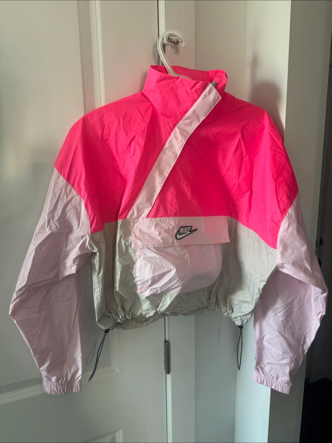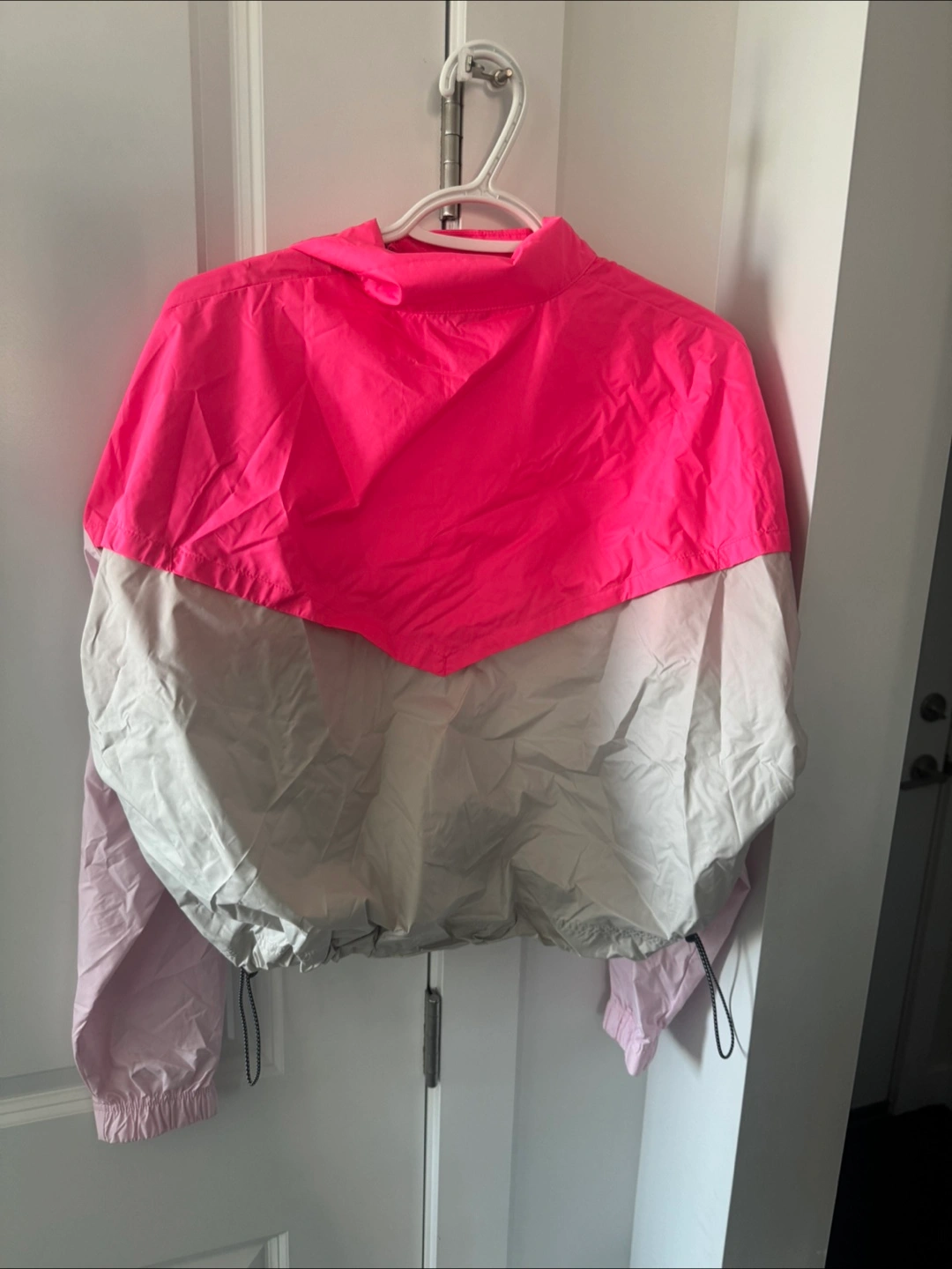 Check out this stylish Nike windbreaker jacket! It features a vibrant pink and grey colour block design. Perfect for adding a pop of colour to your activewear or casual outfits. It's in great condition and ready for a new home