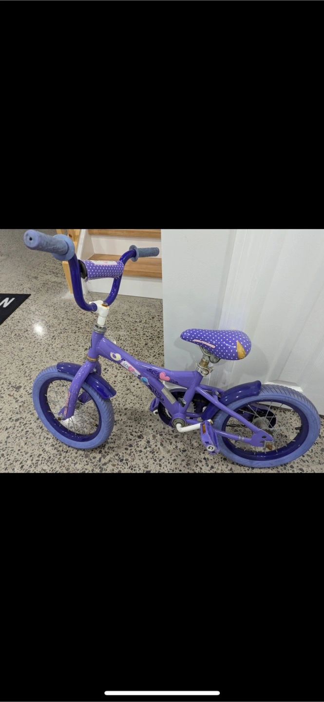 Selling a cute purple bike for girls! Suitable for ages 3-5. There are signs of wear on the seat, but otherwise it's ready to ride! Got this from another karroter and now passing on as my child outgrown this.
