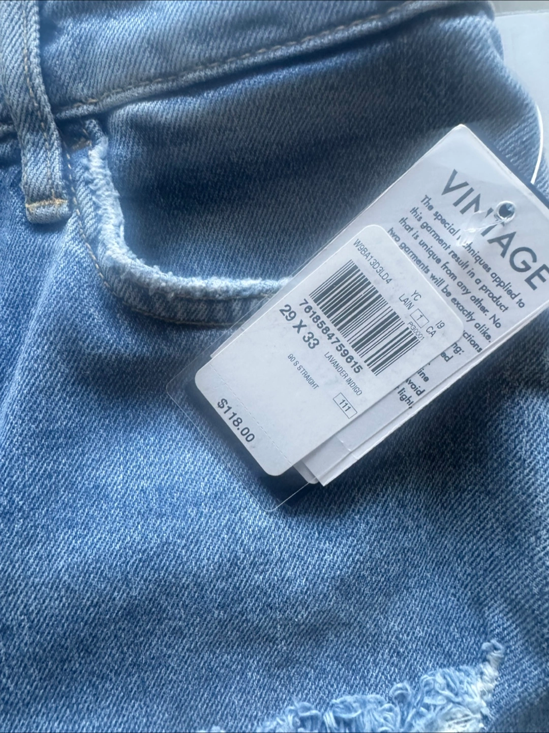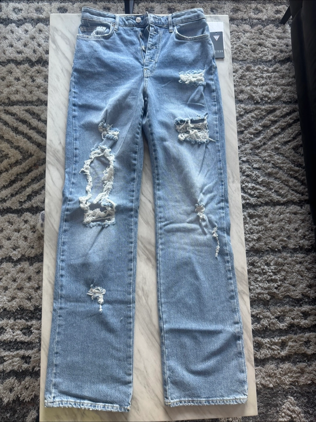 I'm selling a pair of Guess Vintage 90s Straight jeans in size 29x33. They have a distressed look with rips and tears. Originally bought for $118
