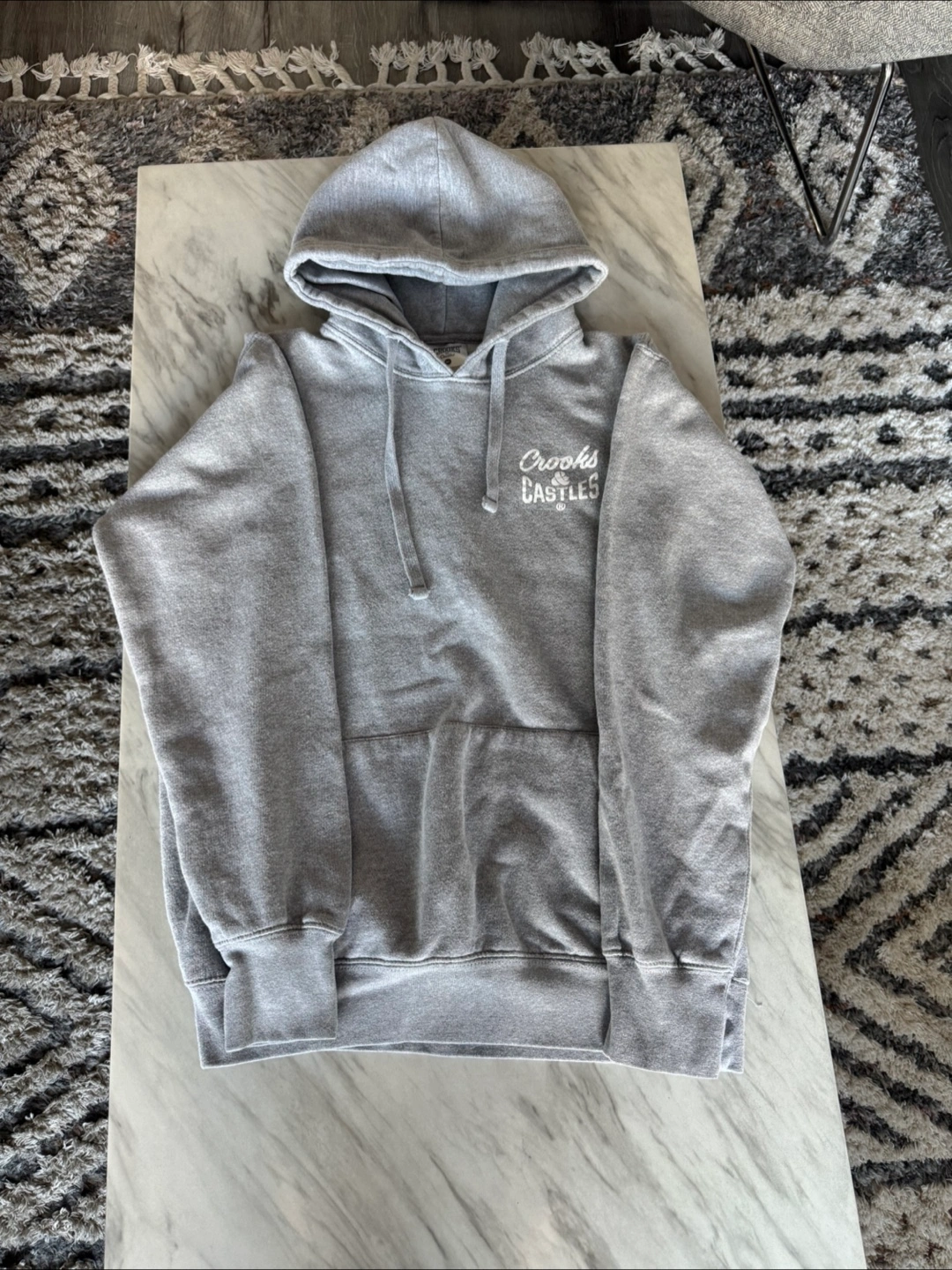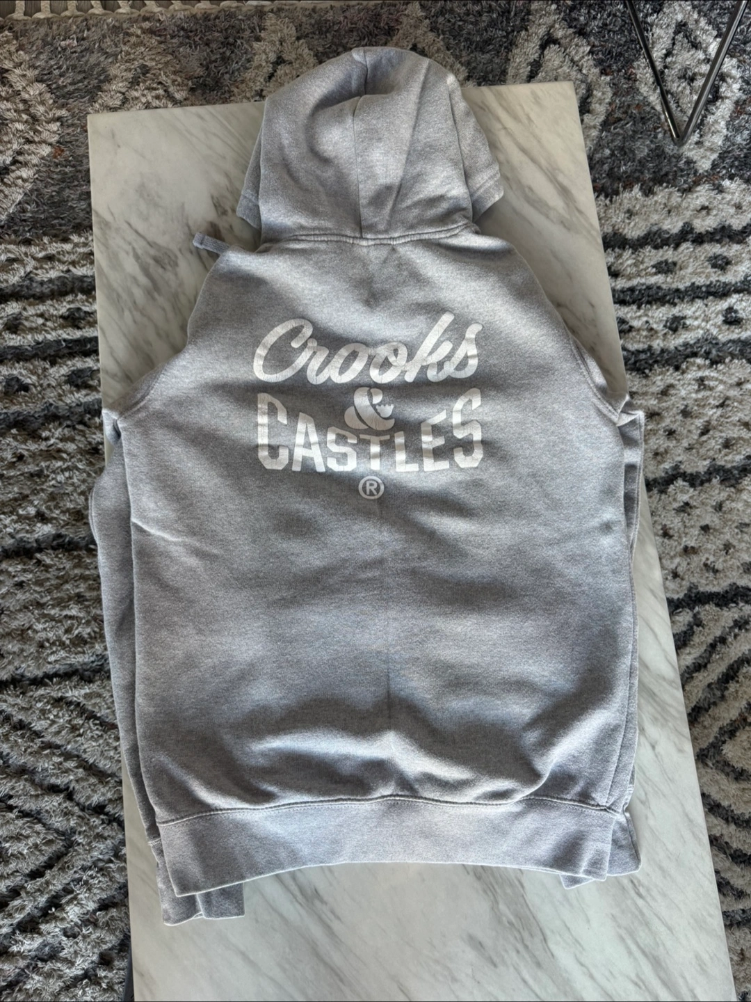 Selling a gently used Crooks & Castles grey hoodie. It's in great shape and ready for a new home! The hoodie features the Crooks & Castles logo on both the front and back. Perfect for casual wear or layering up on cooler days