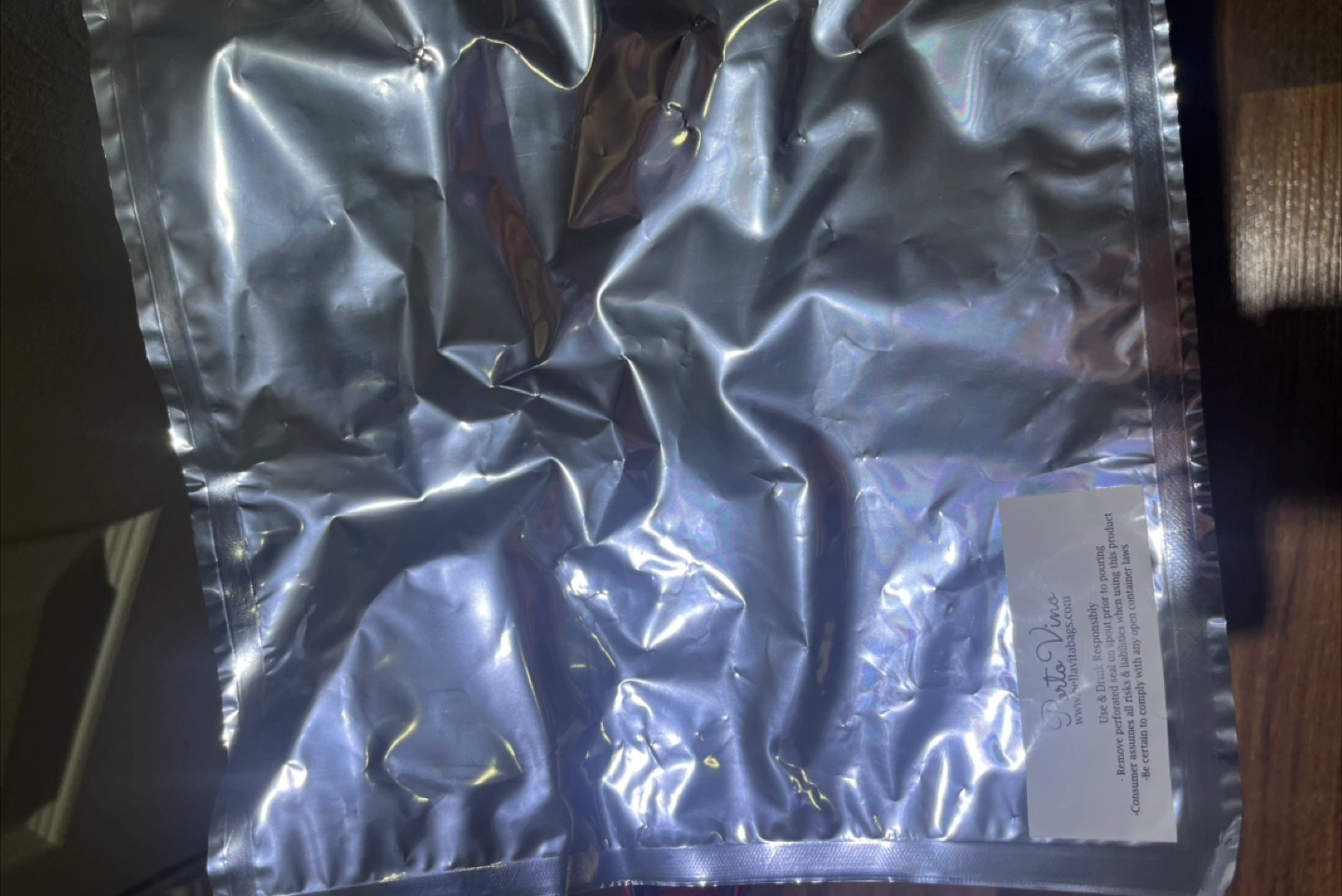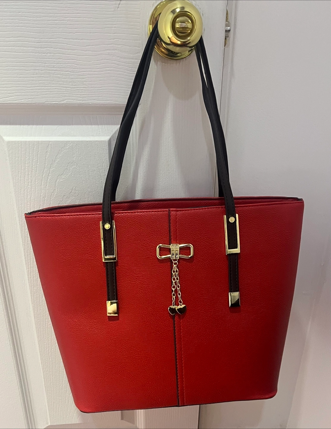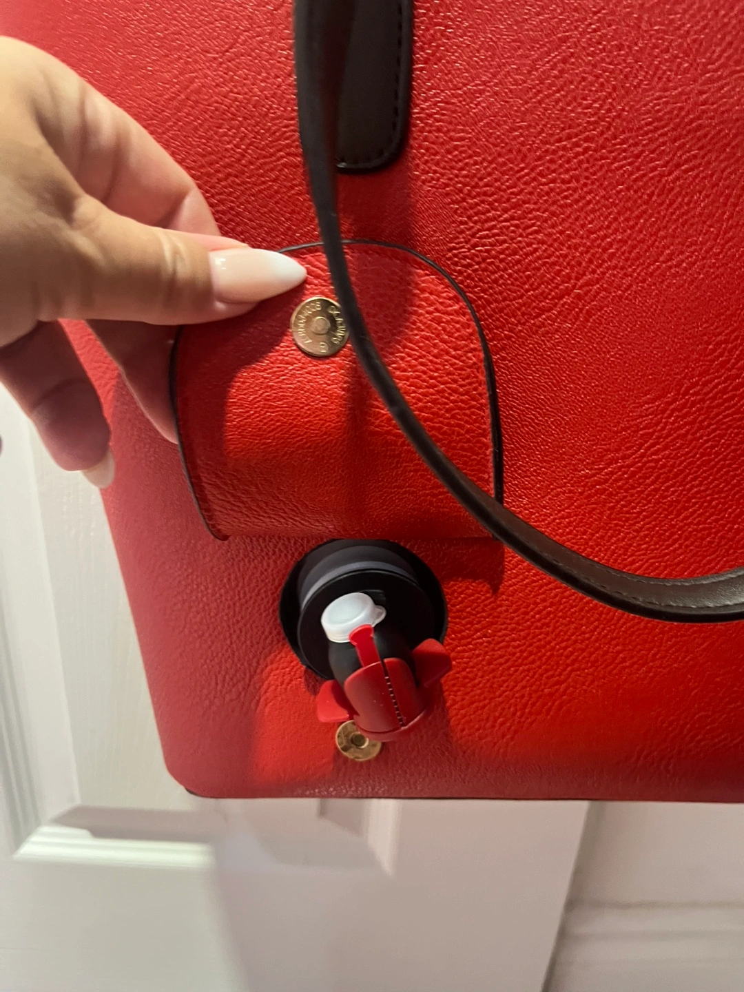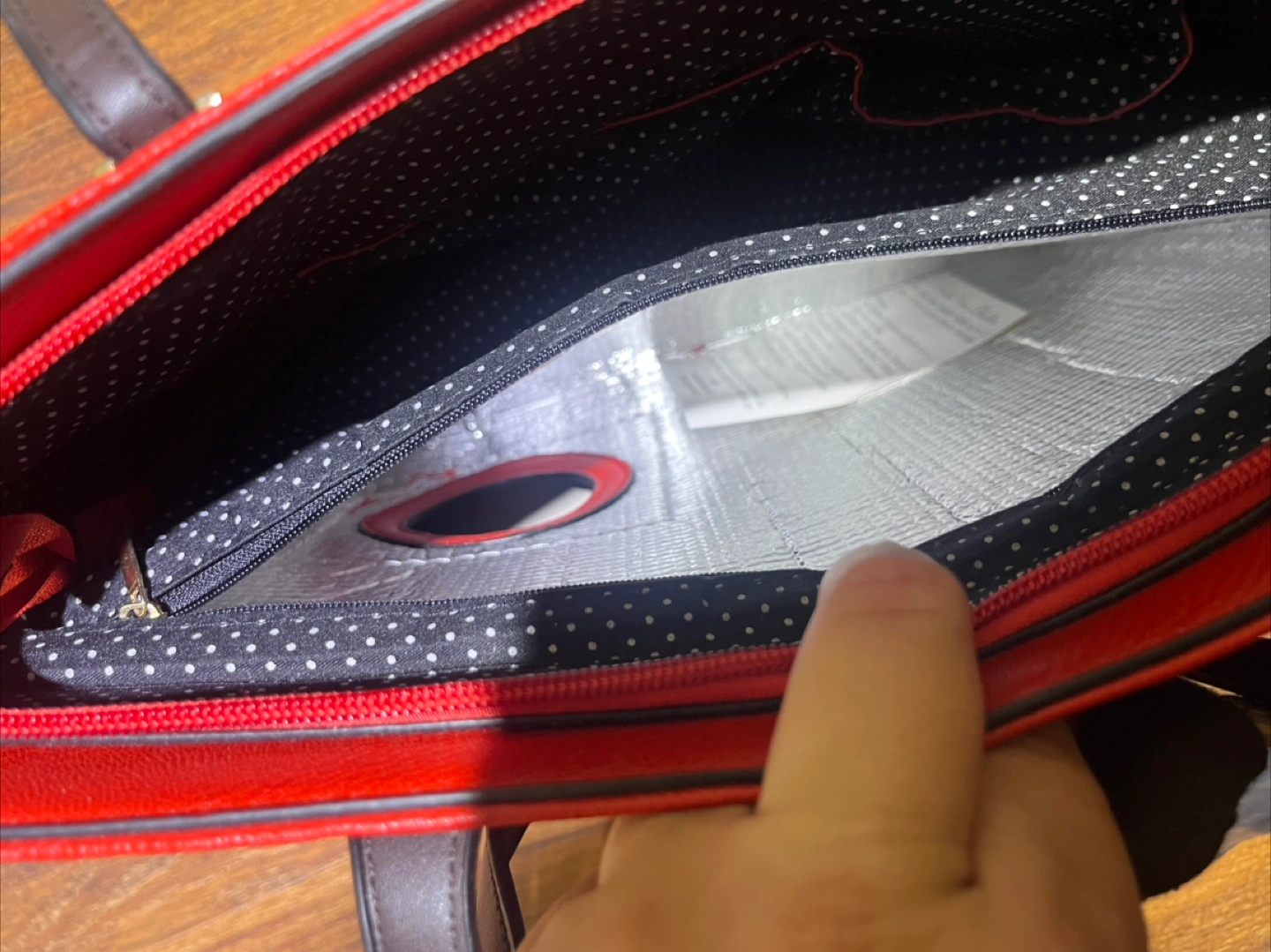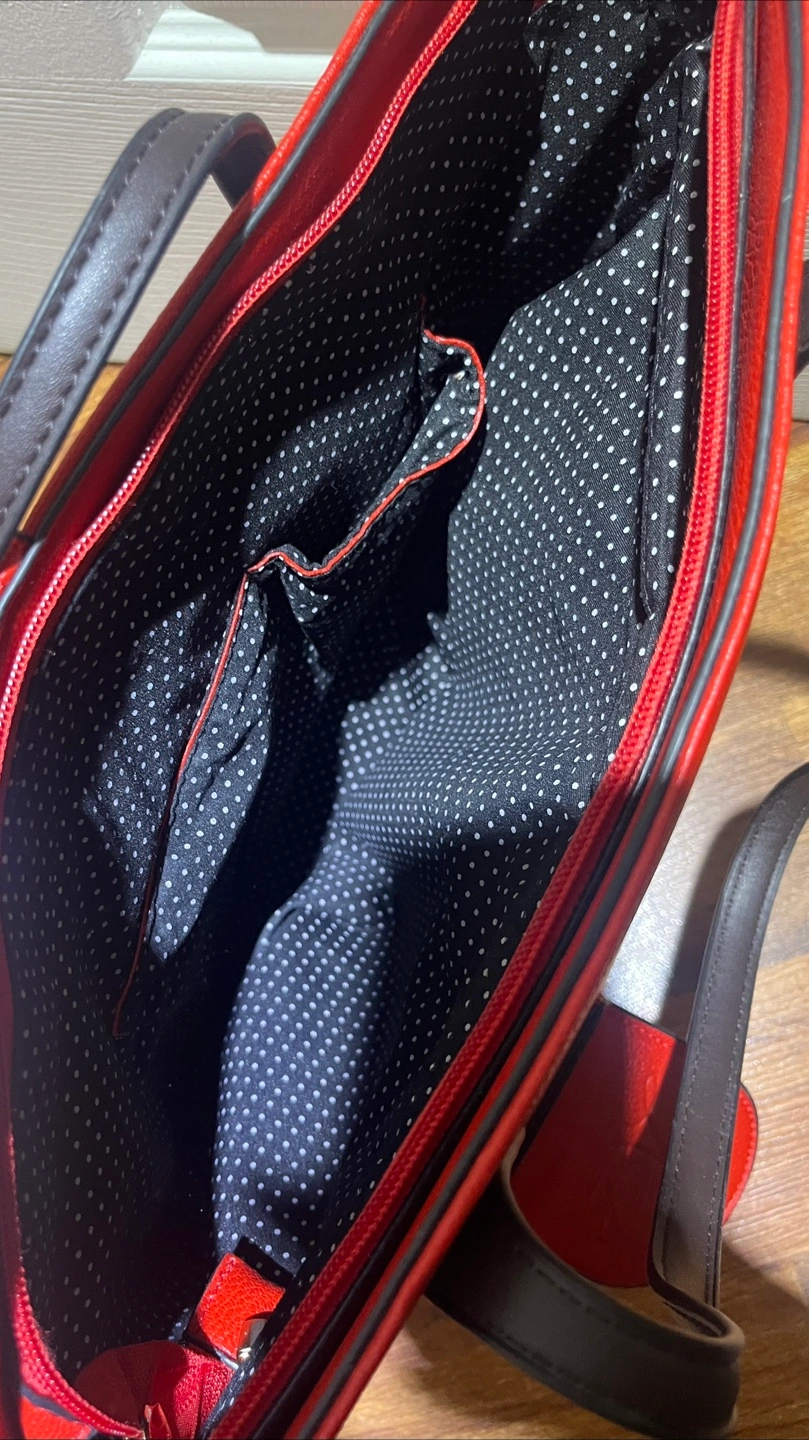 This is a stylish red tote bag with dark brown handles and a fun polka dot interior! It also has a hidden compartment for dispensing wine, perfect for picnics or parties. It's in great condition and ready for a new home