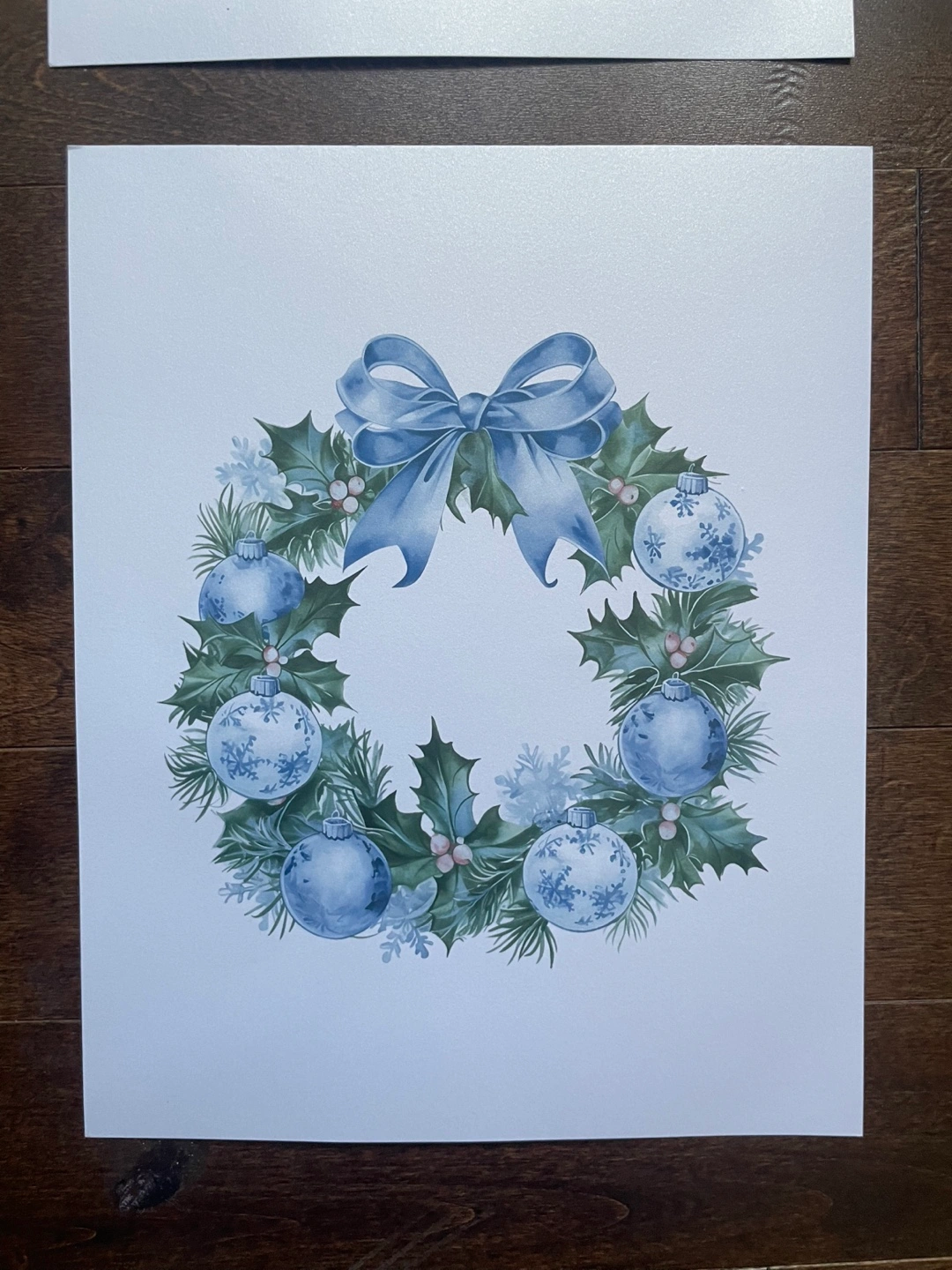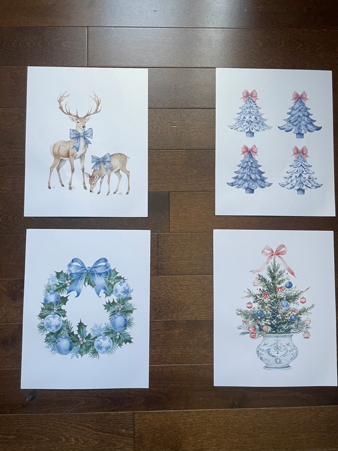 Selling a set of four festive Christmas prints! They feature watercolour-style designs of Christmas trees, wreaths, and deer, all adorned with ribbons and ornaments. These prints would add a lovely touch to your holiday decor