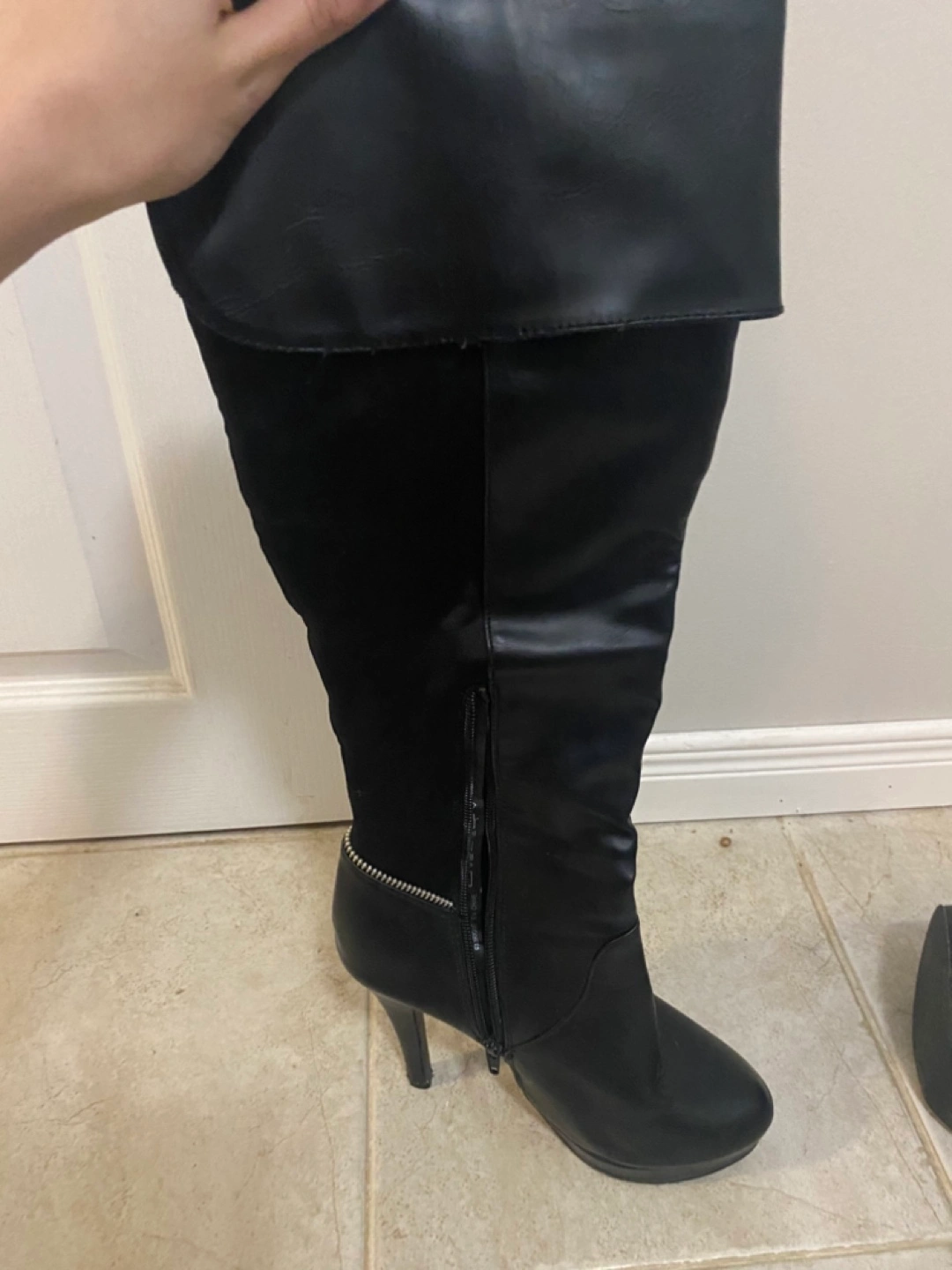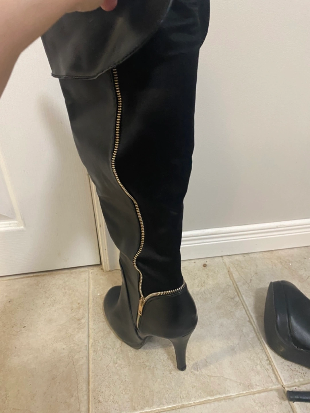 Selling a pair of black thigh-high heel boots. They feature a stylish zipper detail on the side. Perfect for adding a bit of flair to any outfit!