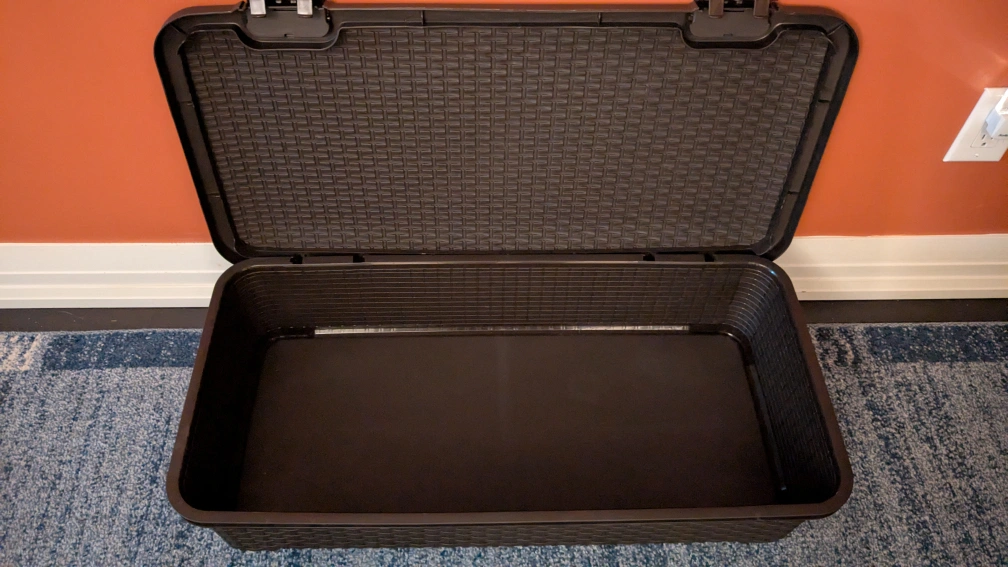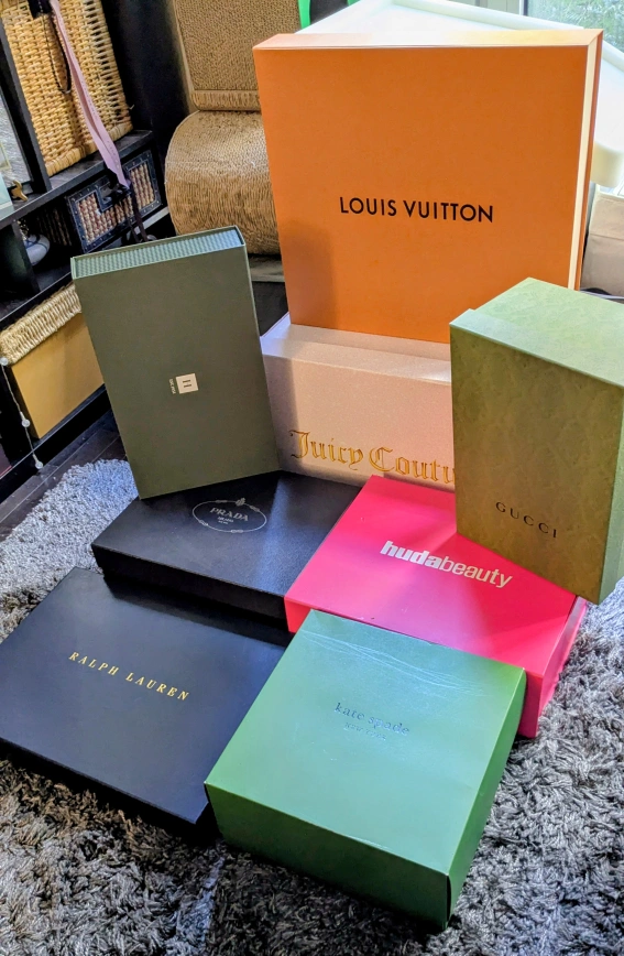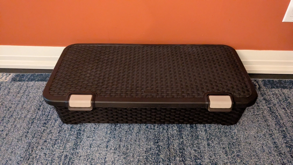 Selling a brown Curver resin wicker storage box. It's perfect for storing items under a bed, inside or outside. Great condition! Including large plastic zip container and 8 good quality designer retail boxes. Great for organising storage.