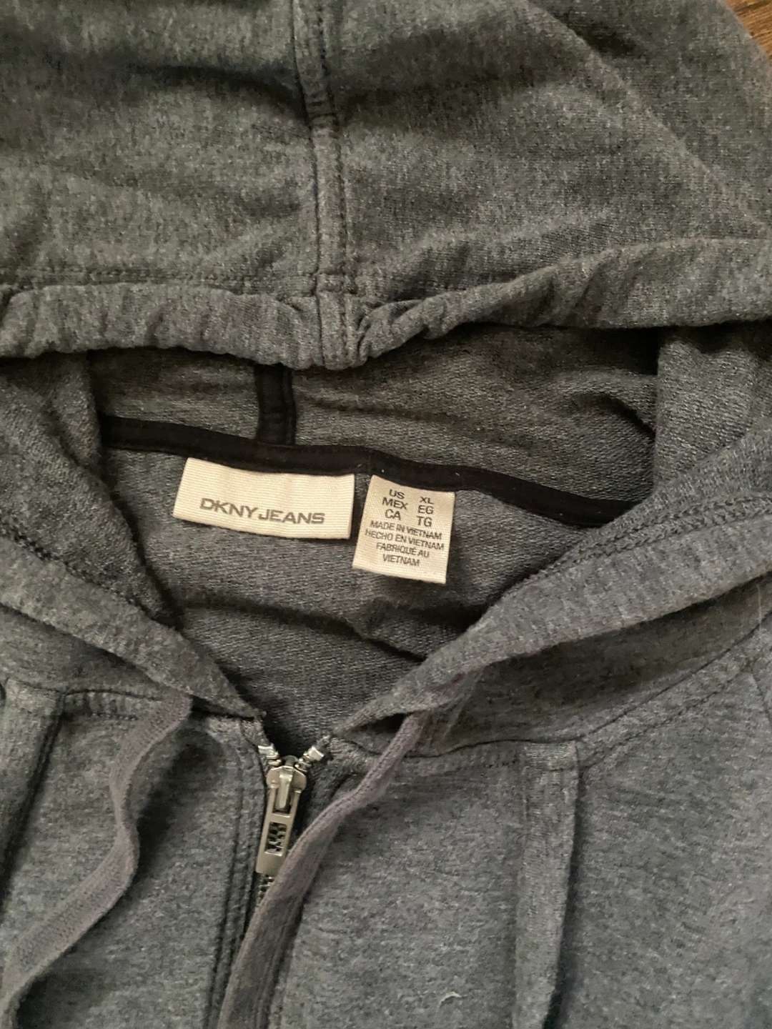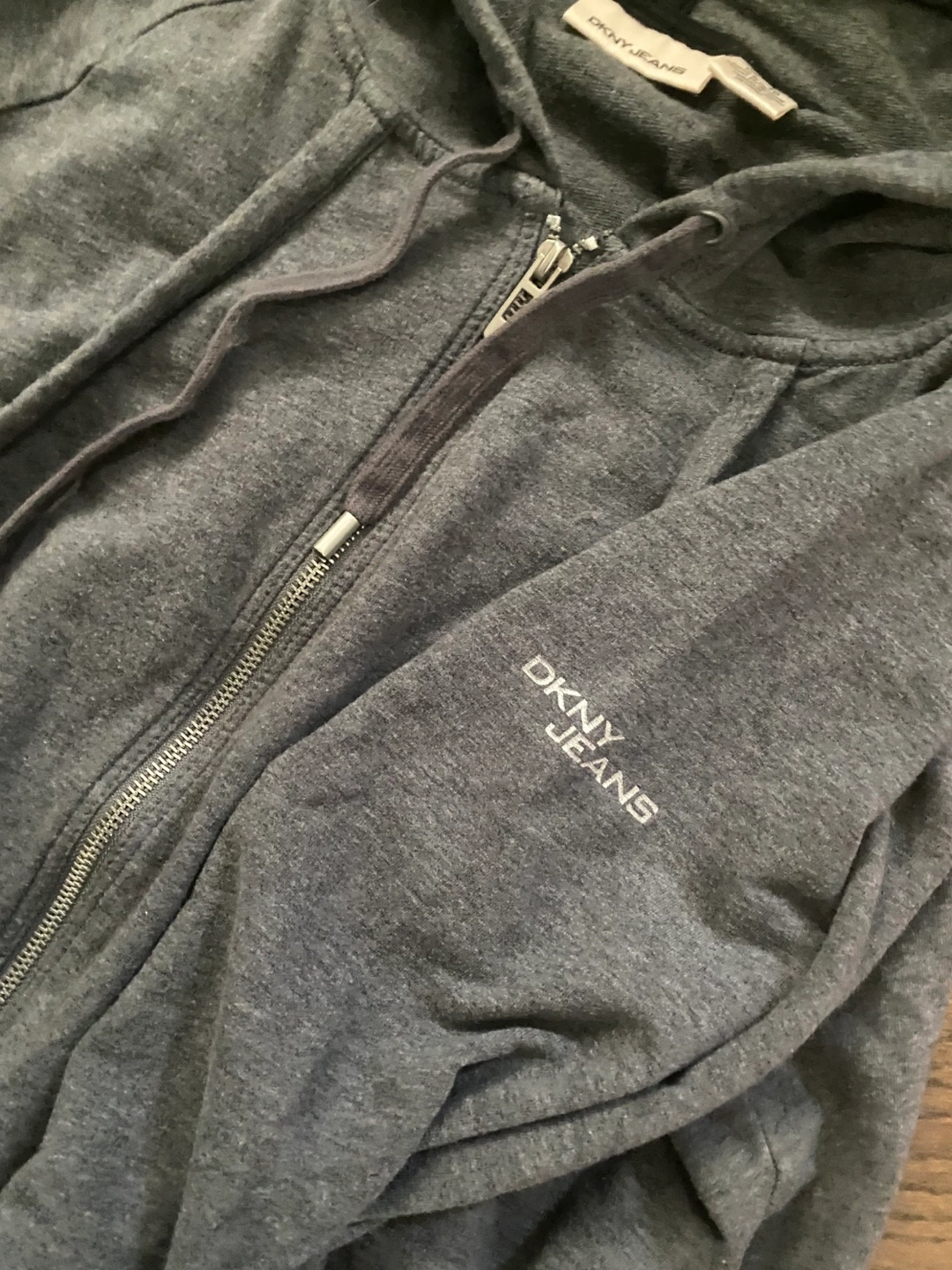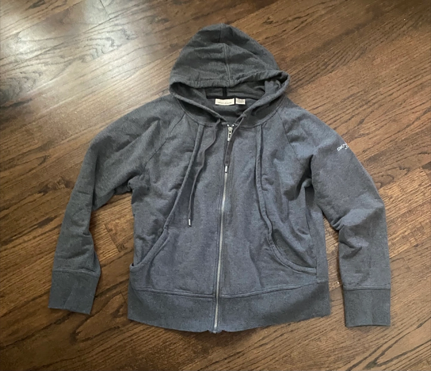 Cozy DKNY Jeans hoodie in size XL! This full-zip hoodie is a stylish and comfortable addition to any wardrobe. The gray colour is versatile, and the DKNY Jeans logo adds a touch of brand recognition. Perfect for layering or wearing on its own on cooler days