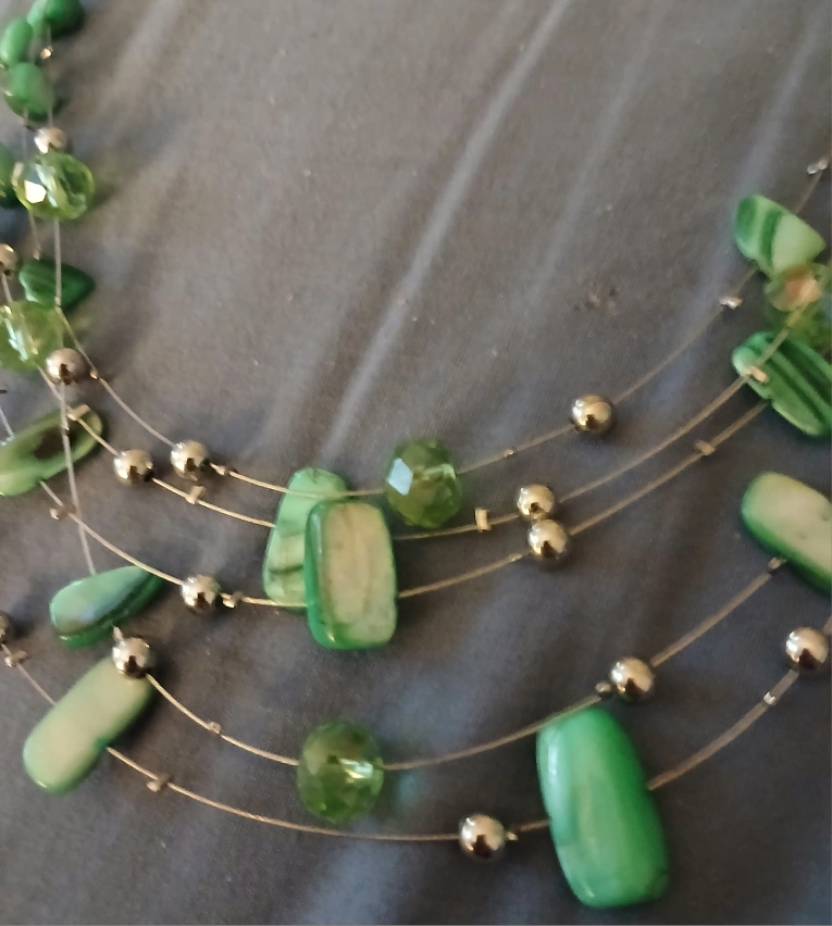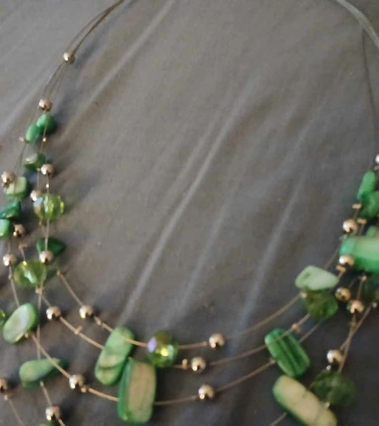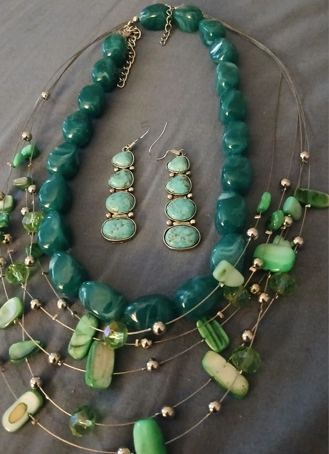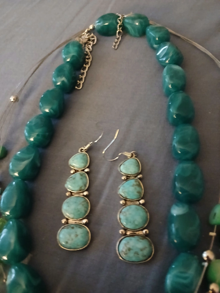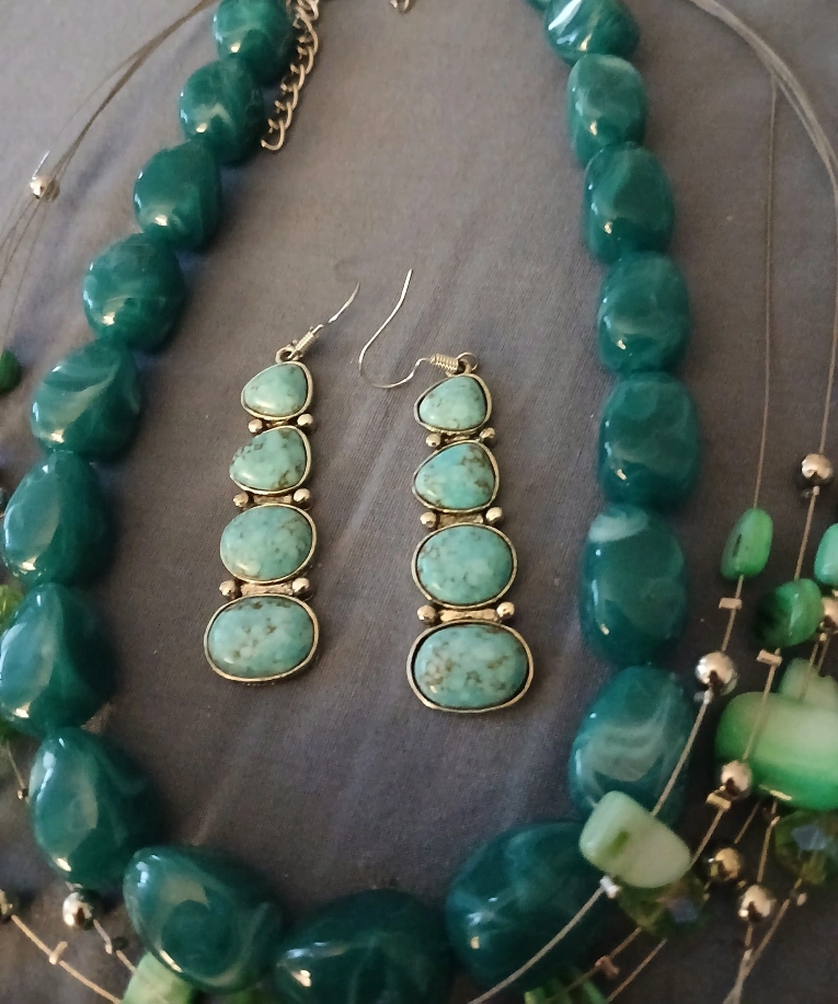 Here's a beautiful green stone necklace and earring set. The necklace has a layered design with various shades of green and silver beads. The earrings feature a tiered stone design with a lovely turquoise hue. plus a other layered.necklace