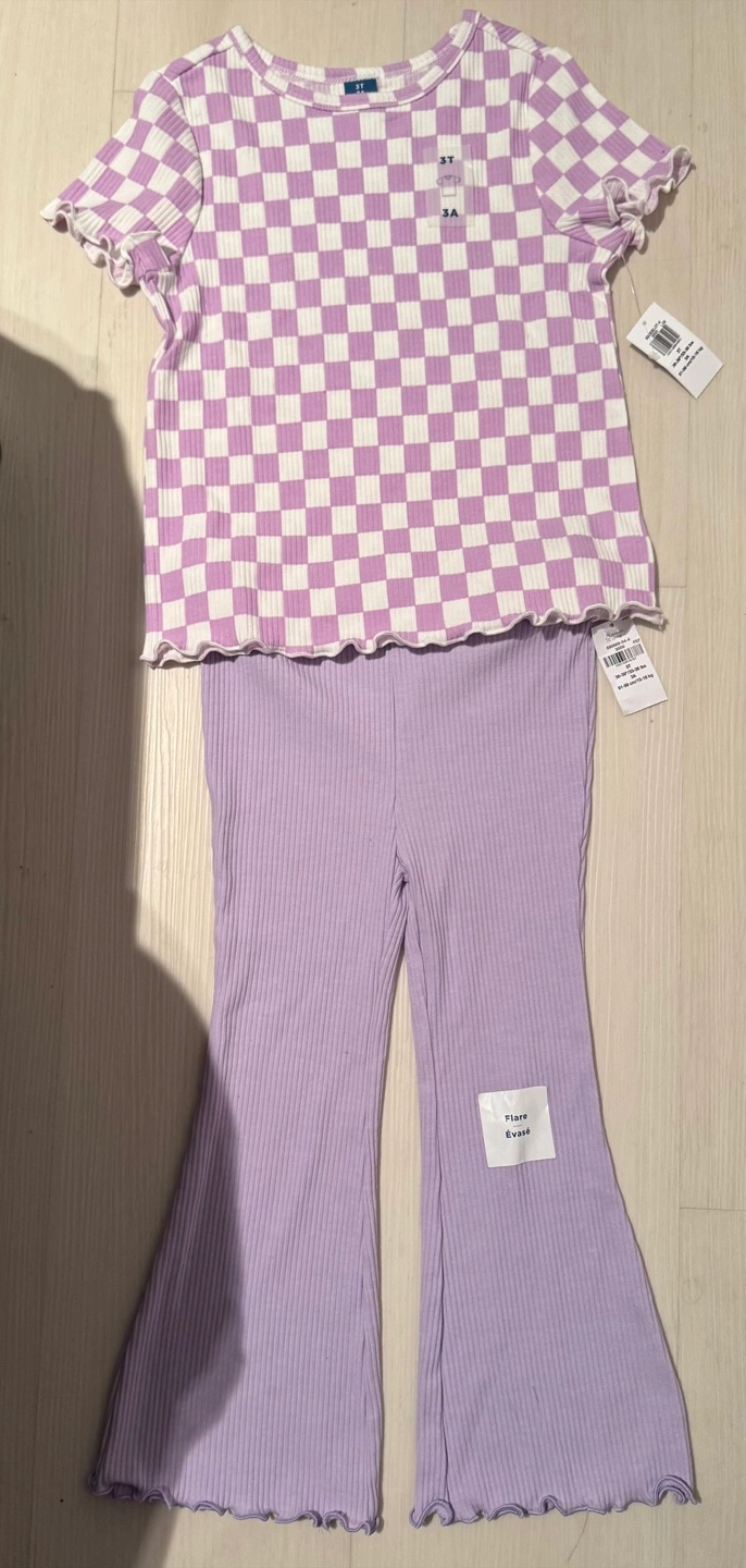 This is a brand new Old Navy outfit for girls, size 3T. It includes a cute checkered top and flare pants. Perfect for your little one!