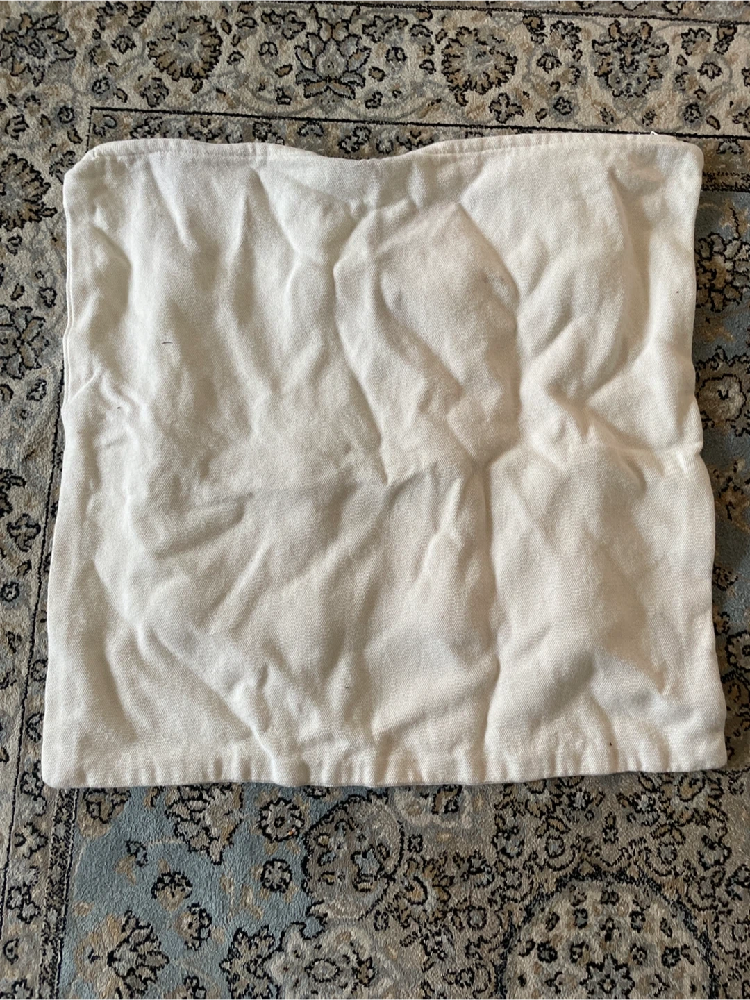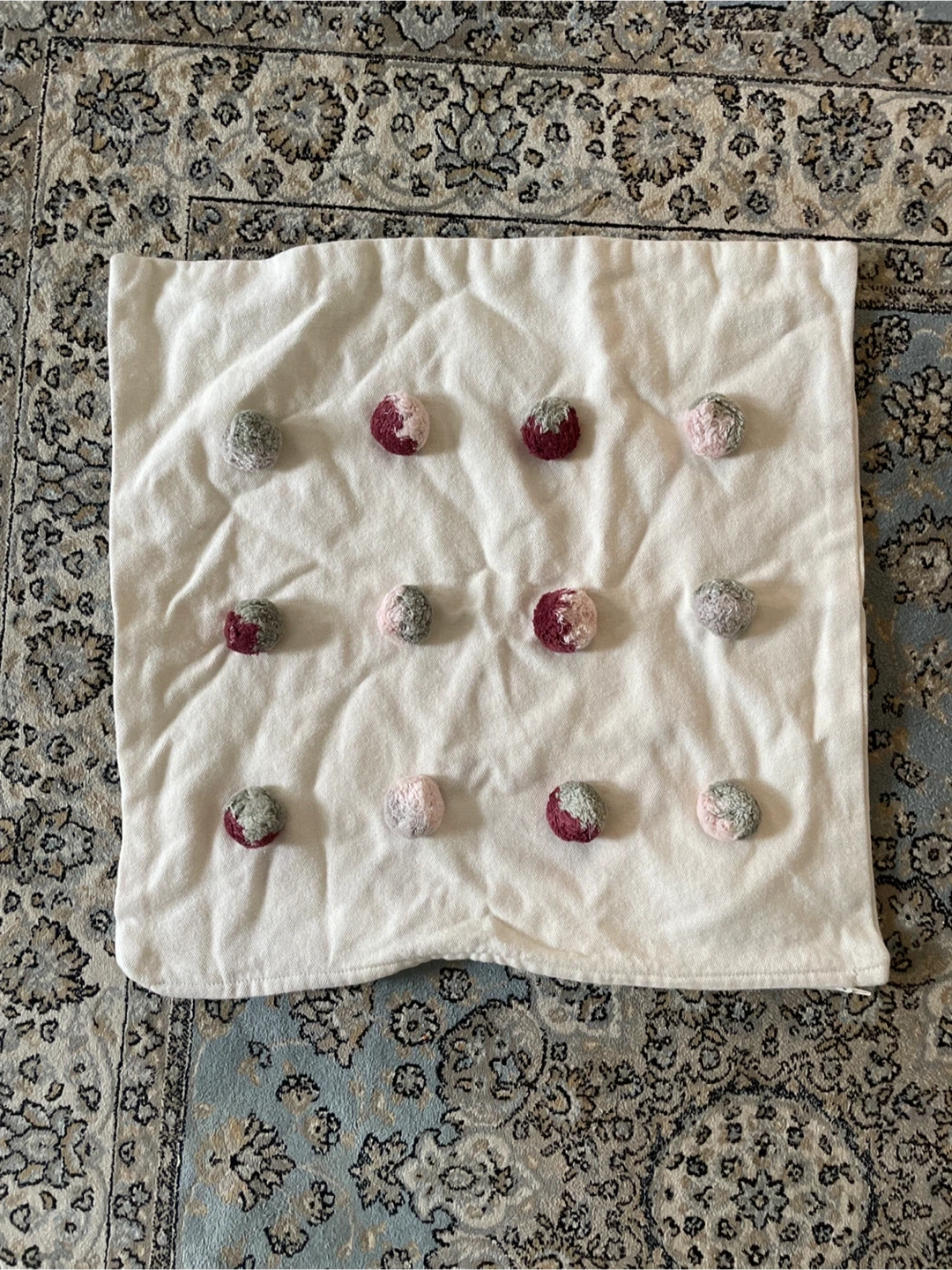Here is a cushion cover. It is white and has pom poms on it. It is in good condition