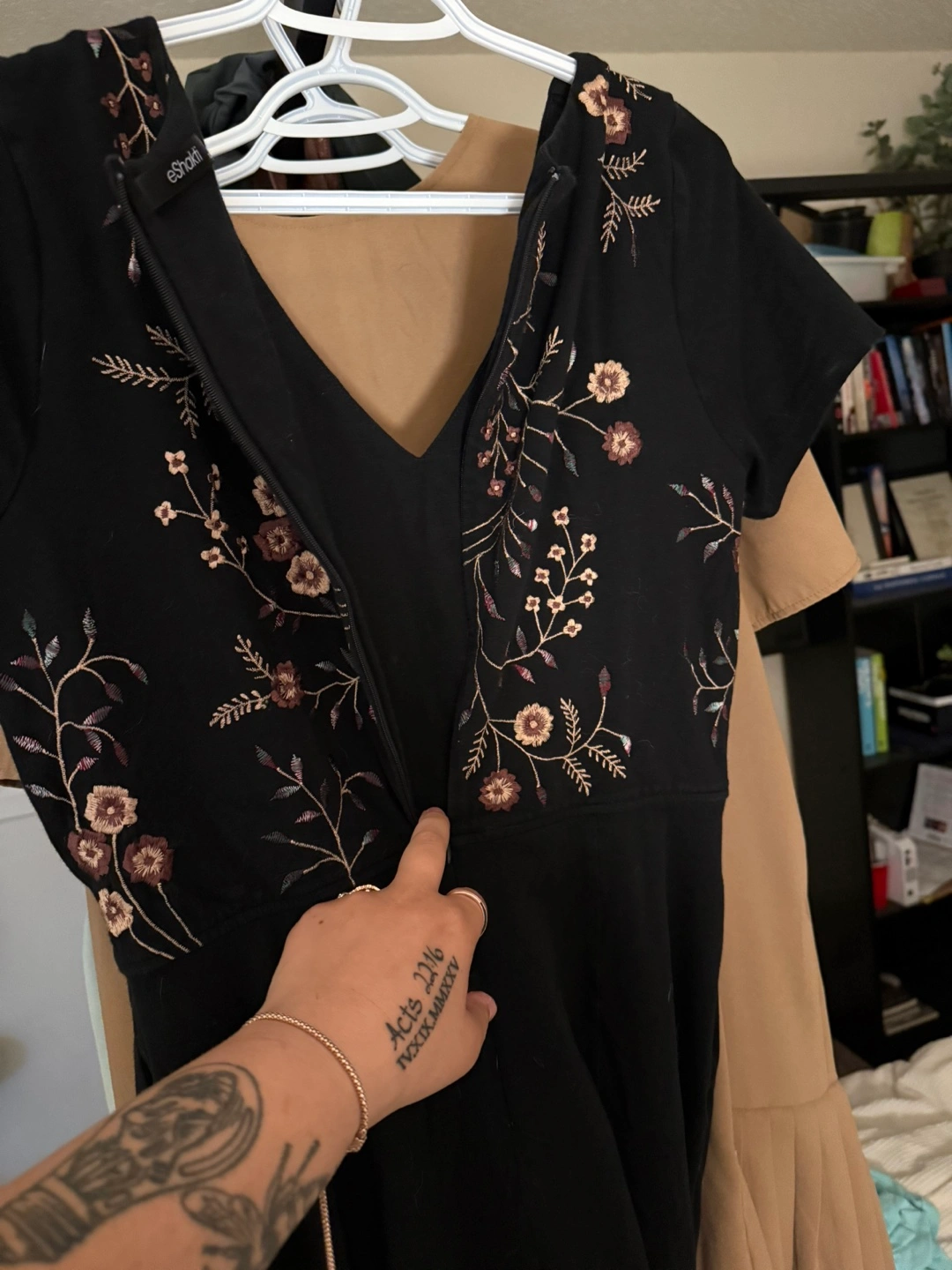 This is a lovely black dress from eShakti with beautiful floral embroidery. It's in great condition and ready for a new home!
