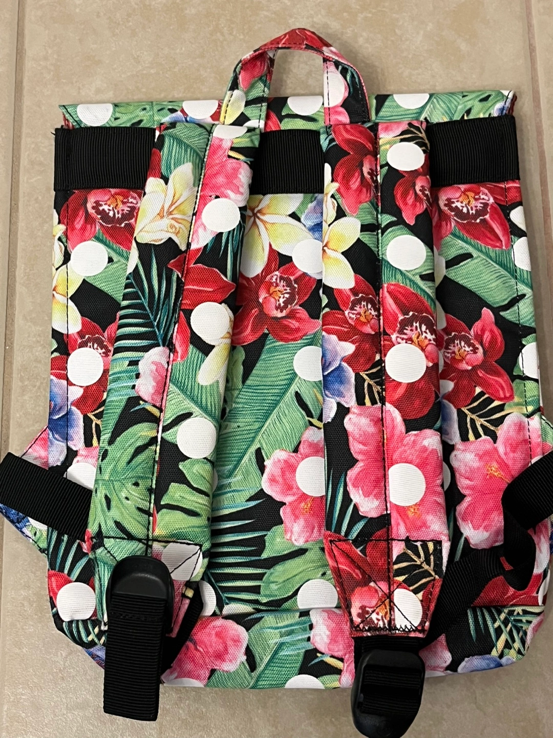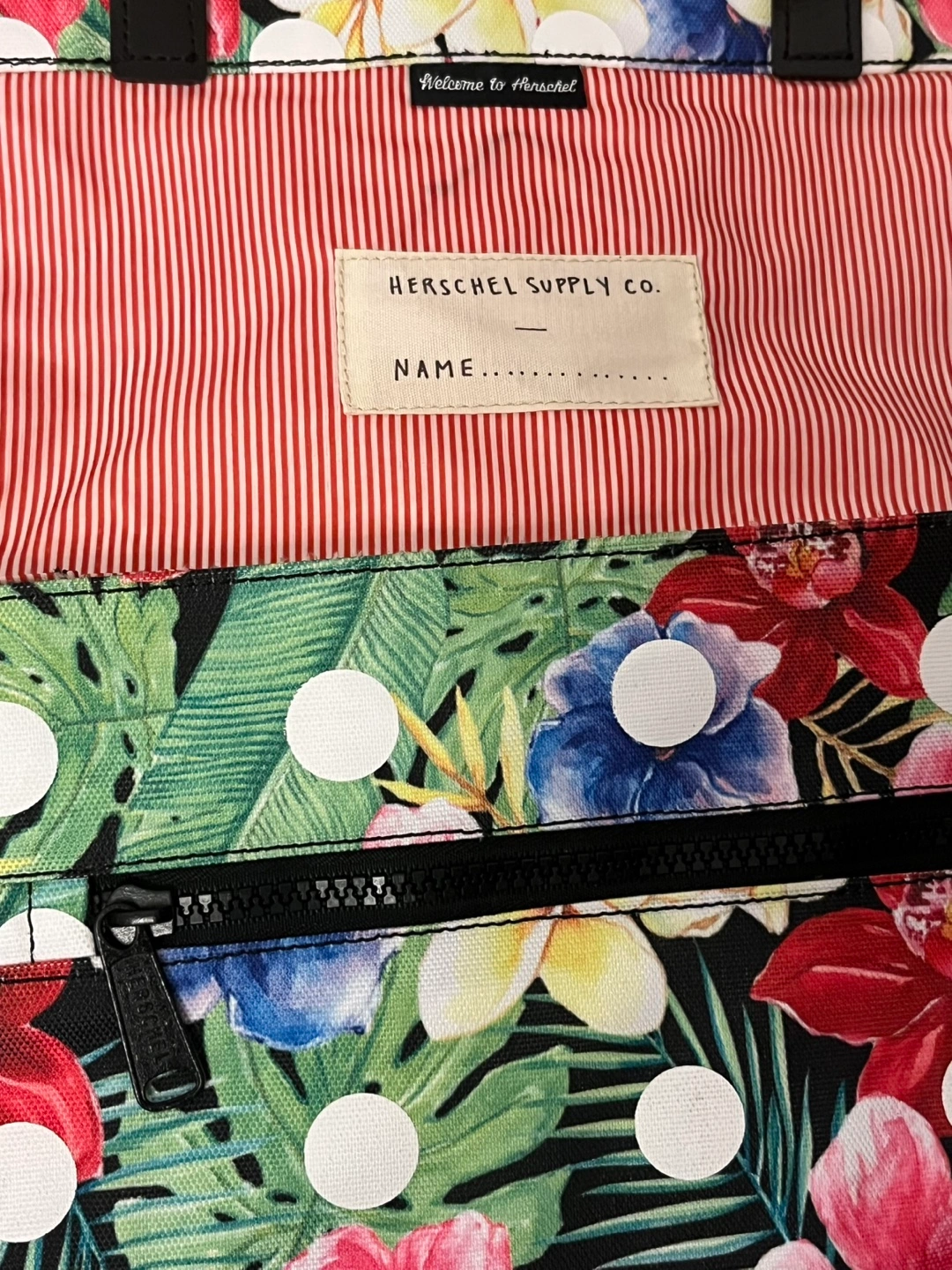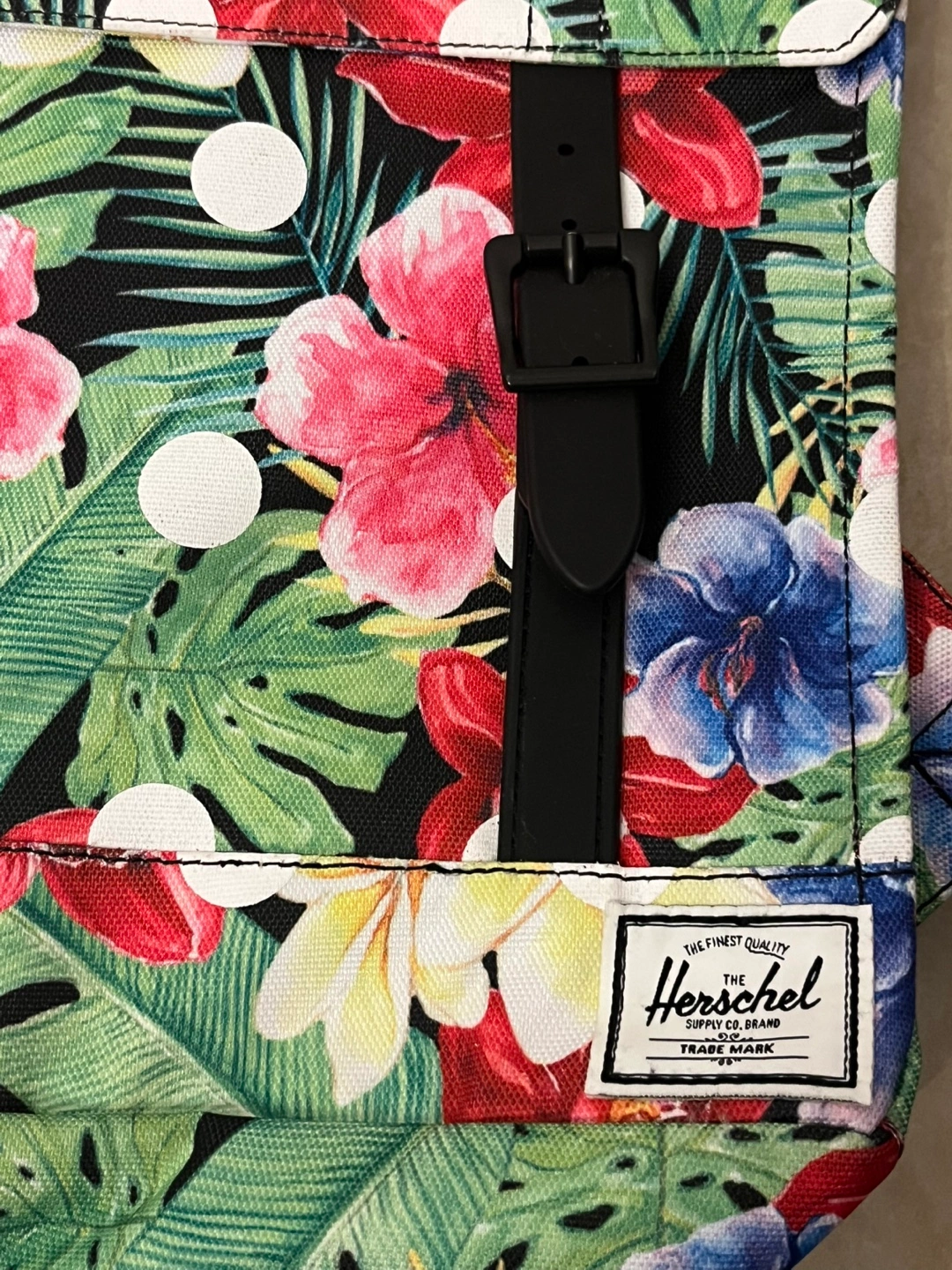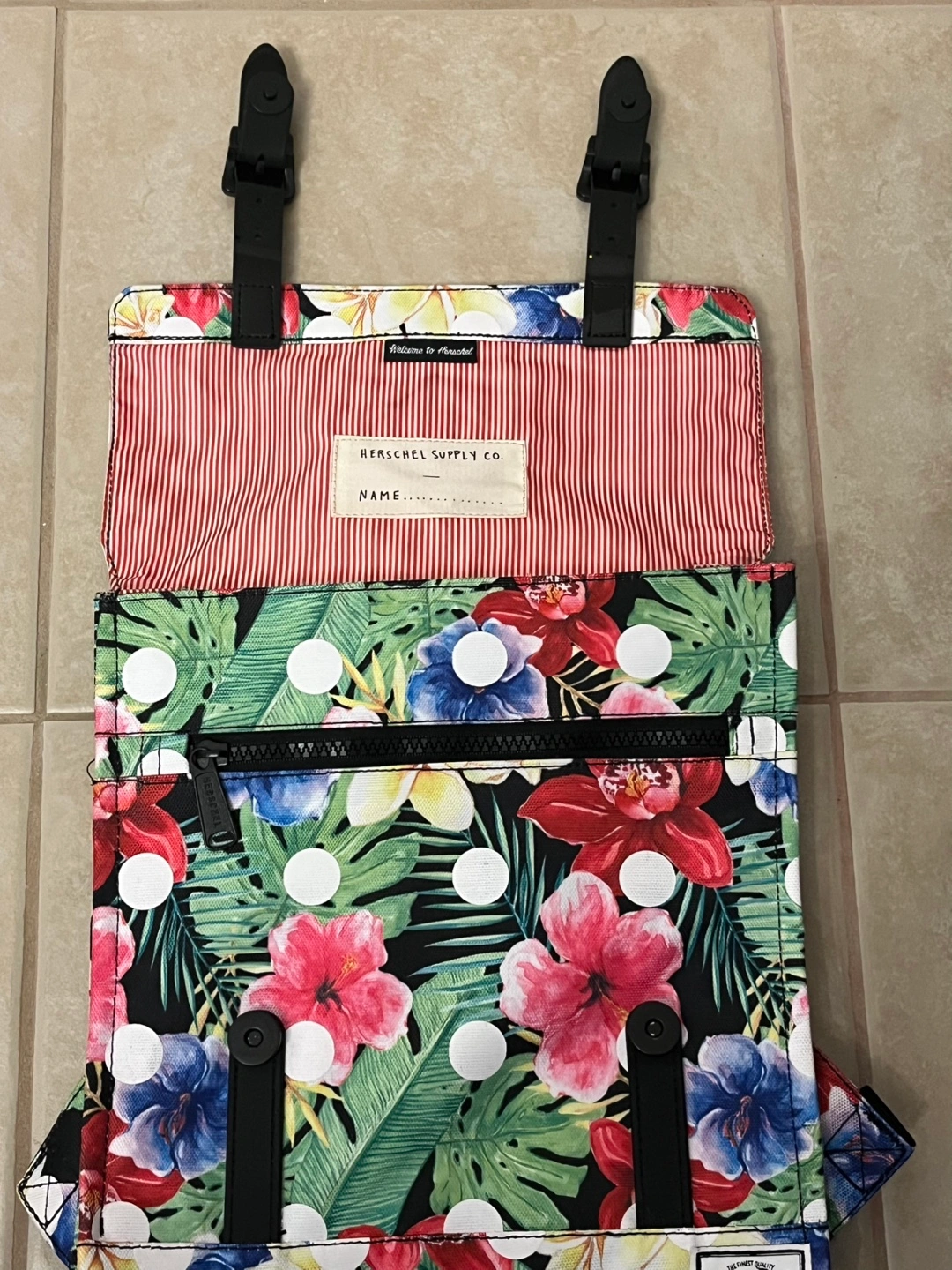 This Herschel backpack features a vibrant floral pattern that's sure to brighten your day! It's perfect for carrying your essentials in style, whether you're heading to school, work, or just out and about. The backpack is practically Brand New and ready for a new adventure. Its measurements are 12 inches x 10 inches x 3 inches.