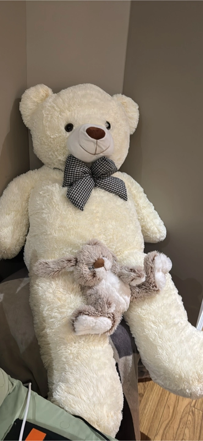 Selling a large, cuddly teddy bear with a cute bunny plush friend! Perfect for snuggling and adding a touch of whimsy to any room. The teddy bear is a lovely cream colour and features a charming checkered bow. It's in great condition and ready for a new home