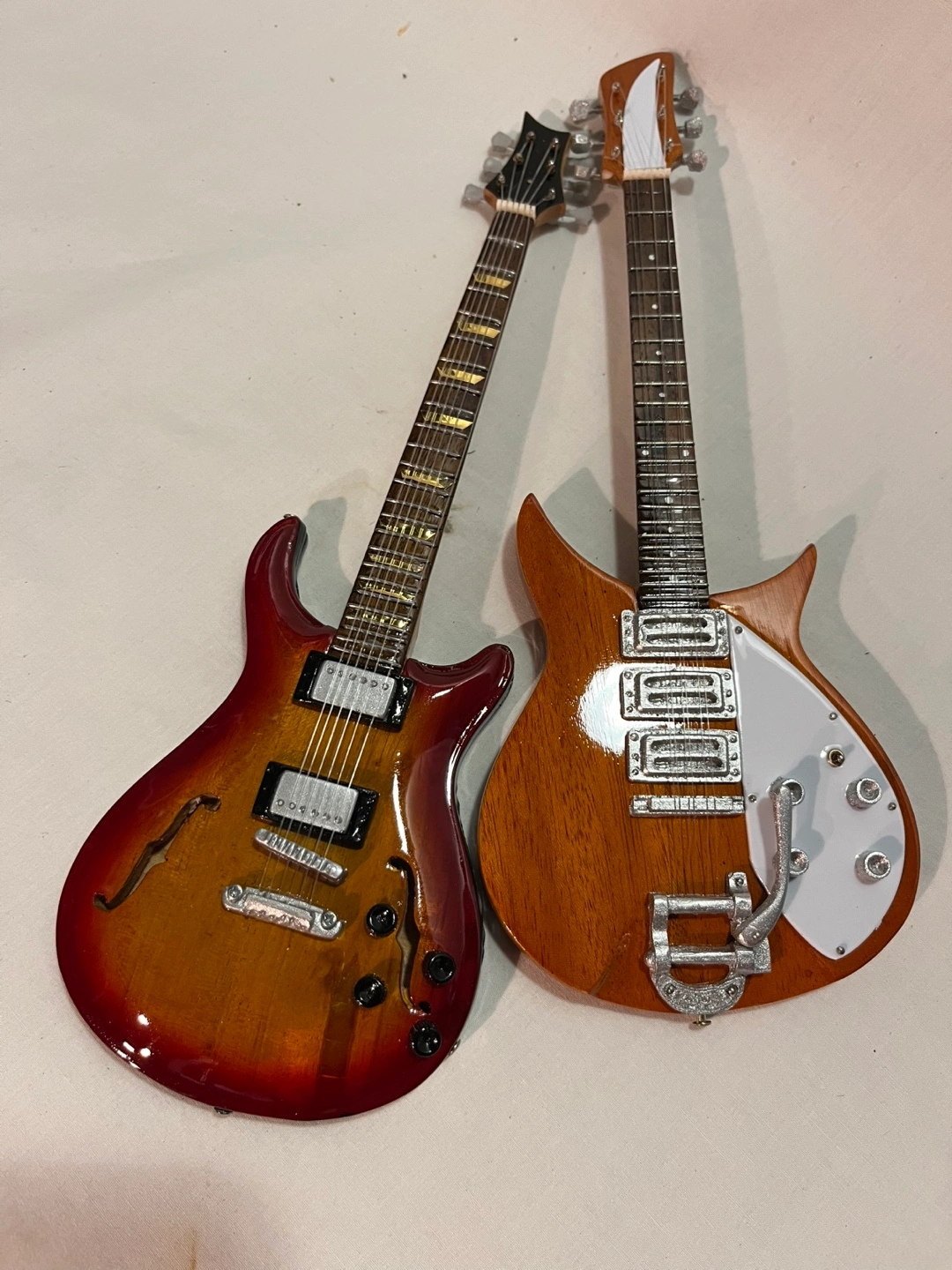 Here's a set of two miniature electric guitars! They're perfect for collectors or music enthusiasts who appreciate detailed craftsmanship. The guitars have a beautiful finish and intricate design that captures the essence of real electric guitars. A great addition to any display or collection! 10 inches tall, not playable!
