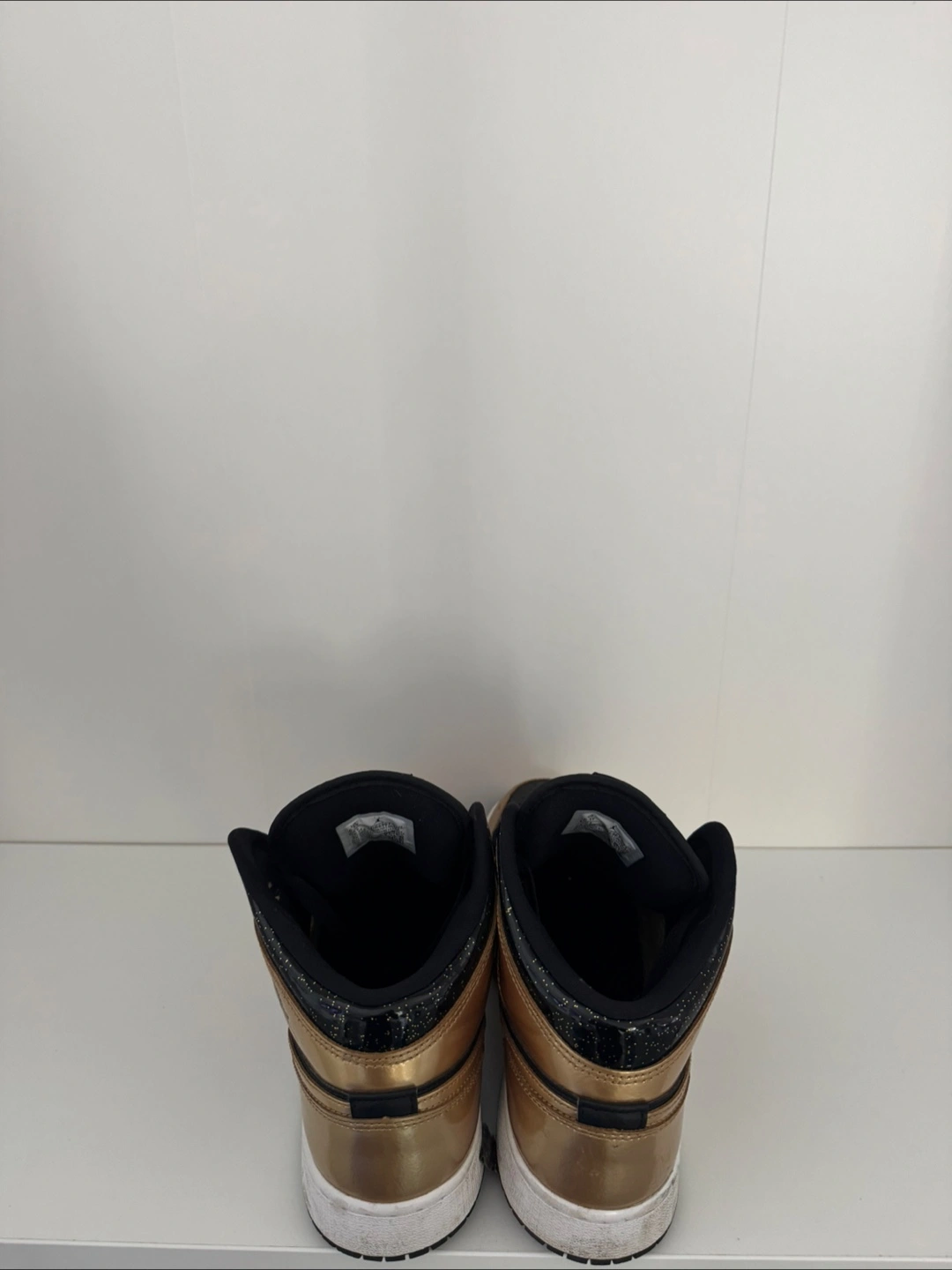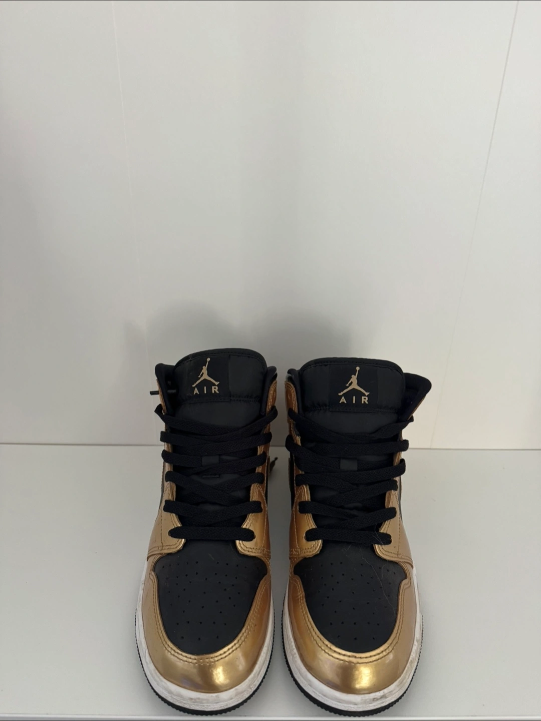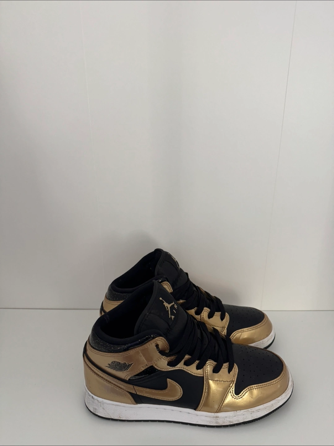 Selling a pair of Air Jordan 1 Mid sneakers in black and gold. They are in great condition and ready for a new home!