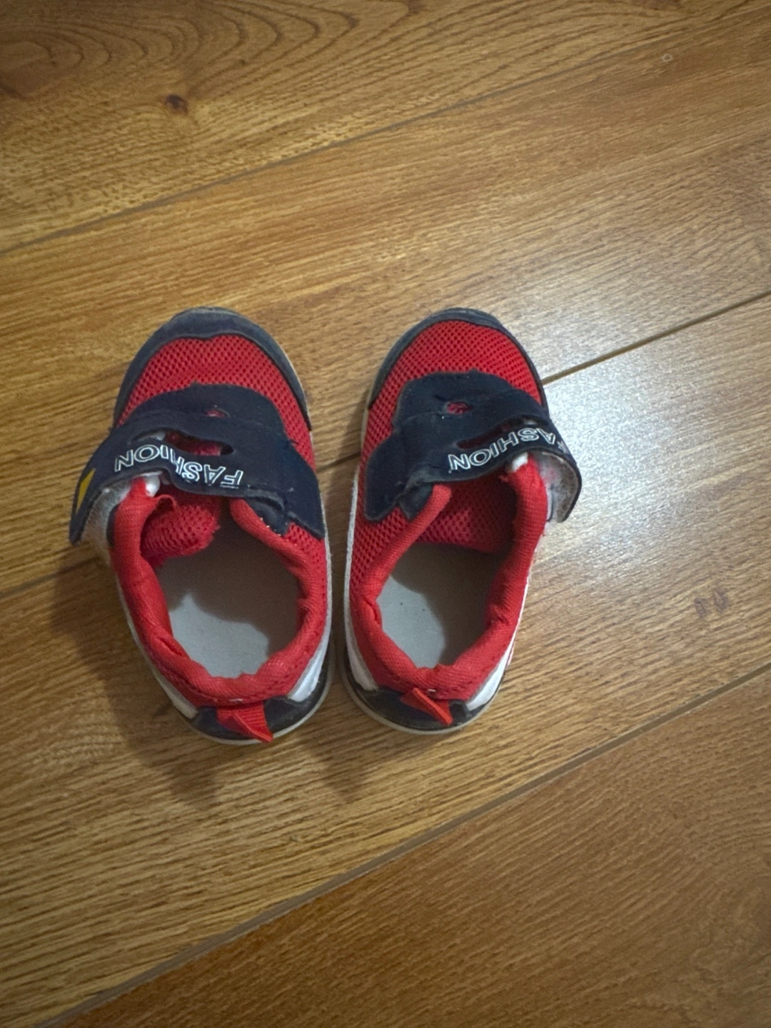 These cute toddler shoes are in great shape! They're red with navy accents and have a velcro strap for easy on and off. Perfect for your little one's adventures