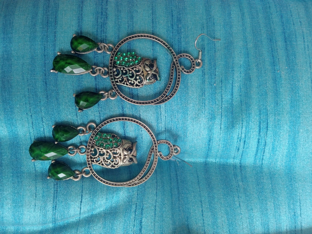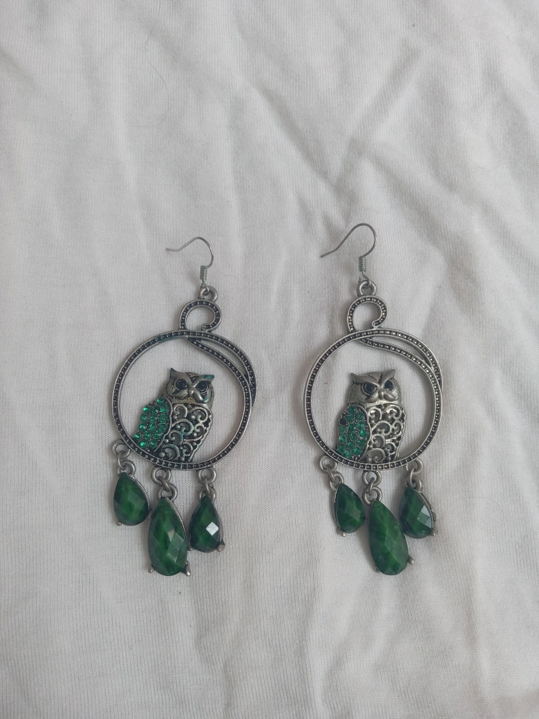 These cute owl earrings feature a silver-tone design with green gem accents. They have a dangle style with green teardrop-shaped beads. Perfect for adding a touch of whimsy to any outfit!