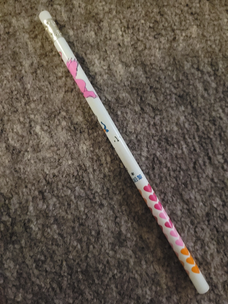 Here's a cute pencil with a white body decorated with pink hearts and a pink cupids. It includes an eraser at the top. Perfect for school or art projects!