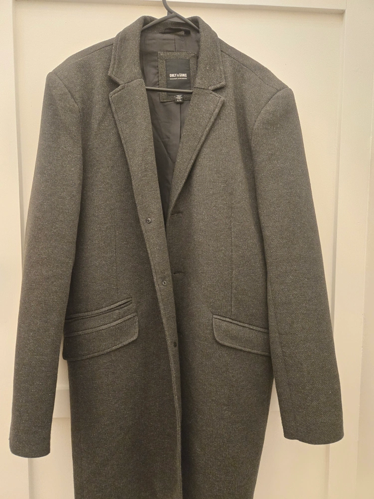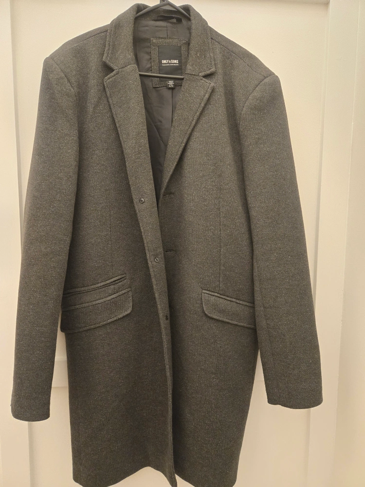 Here's a stylish new never worn wool blend overcoat from ONLY & SONS. It's a size XL and in great condition. Perfect for adding a touch of class to your wardrobe!