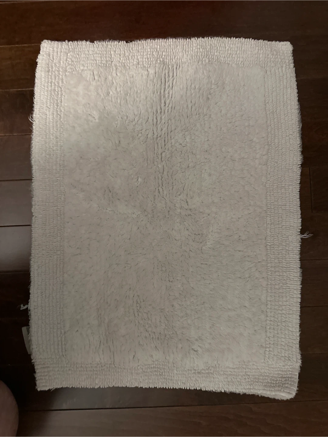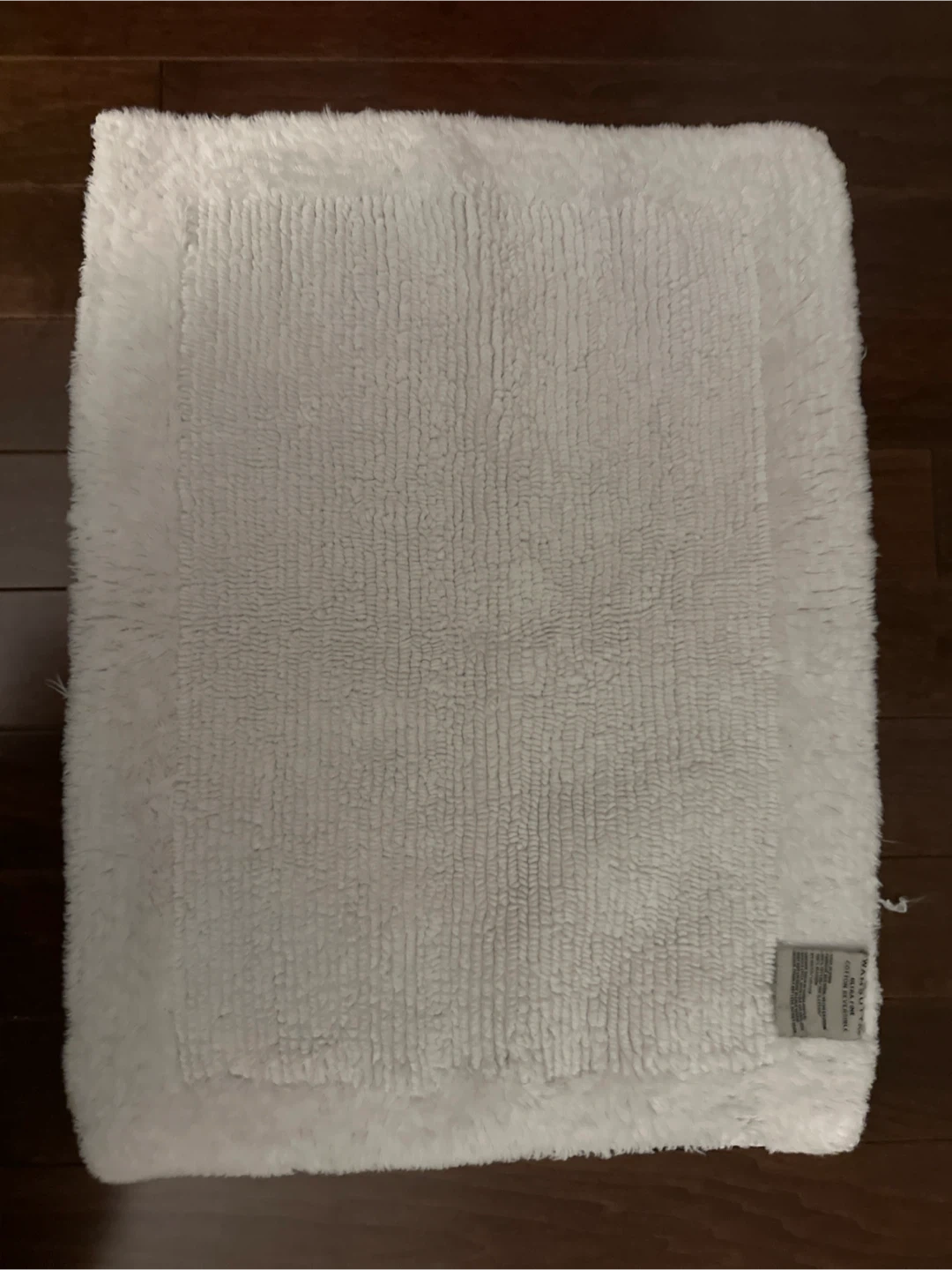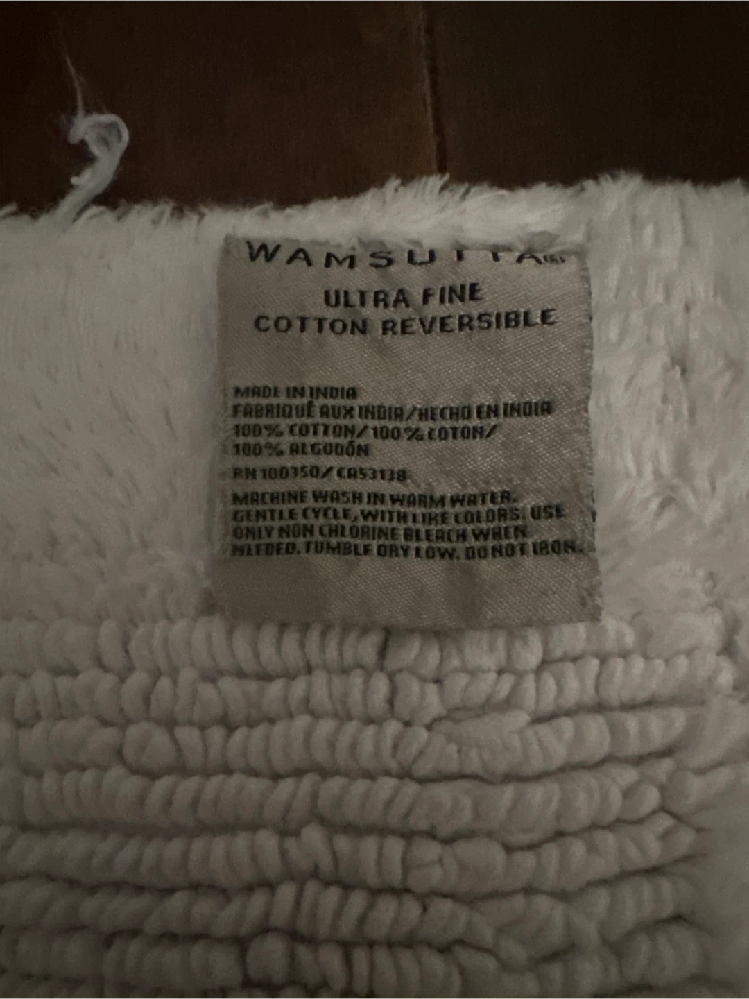 This is a Wamsutta Ultra Fine Cotton Reversible bath mat. It's made of 100% cotton and is machine washable. Made in India