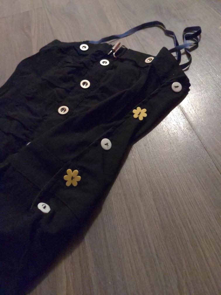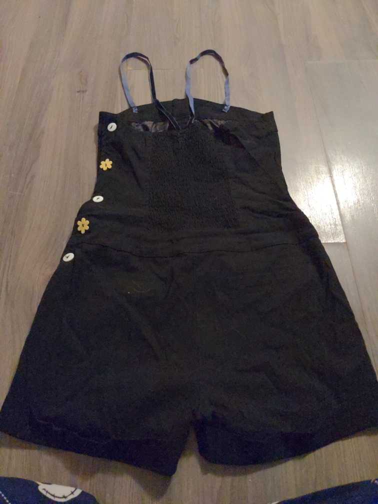 Selling a cute black romper! It features a strapless design with thin straps and fun floral buttons on the side. Perfect for a casual summer day or a night out
