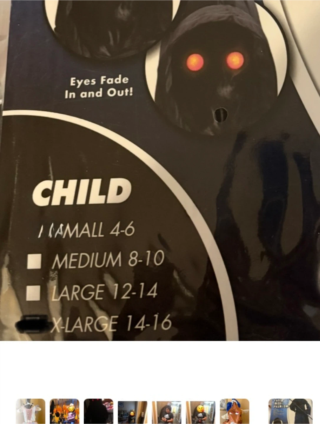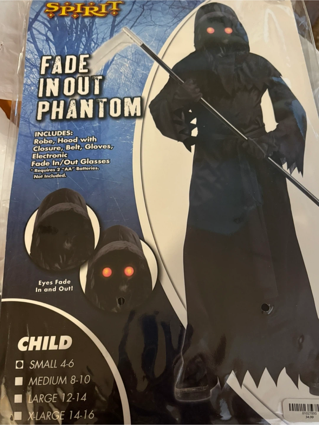Selling a Spirit brand Fade In/Out Phantom costume for a child. The costume includes the robe, hood with closure, belt, gloves, and electronic fade in/out glasses. Requires 2 AA batteries (not included) 2 available : •size small (4-6) with package •size X-Large (14-16) Cash only pick up Richmond hill