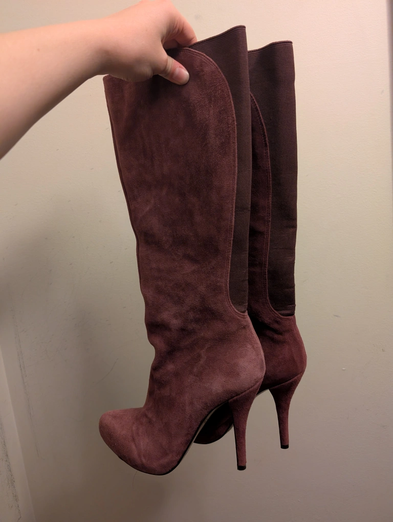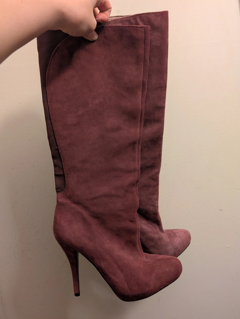 Here are a pair of Enzo Angiolini knee-high boots in a beautiful burgundy suede. They're a size 6.5M and have a stylish, classic look. Perfect for adding a touch of elegance to any outfit!