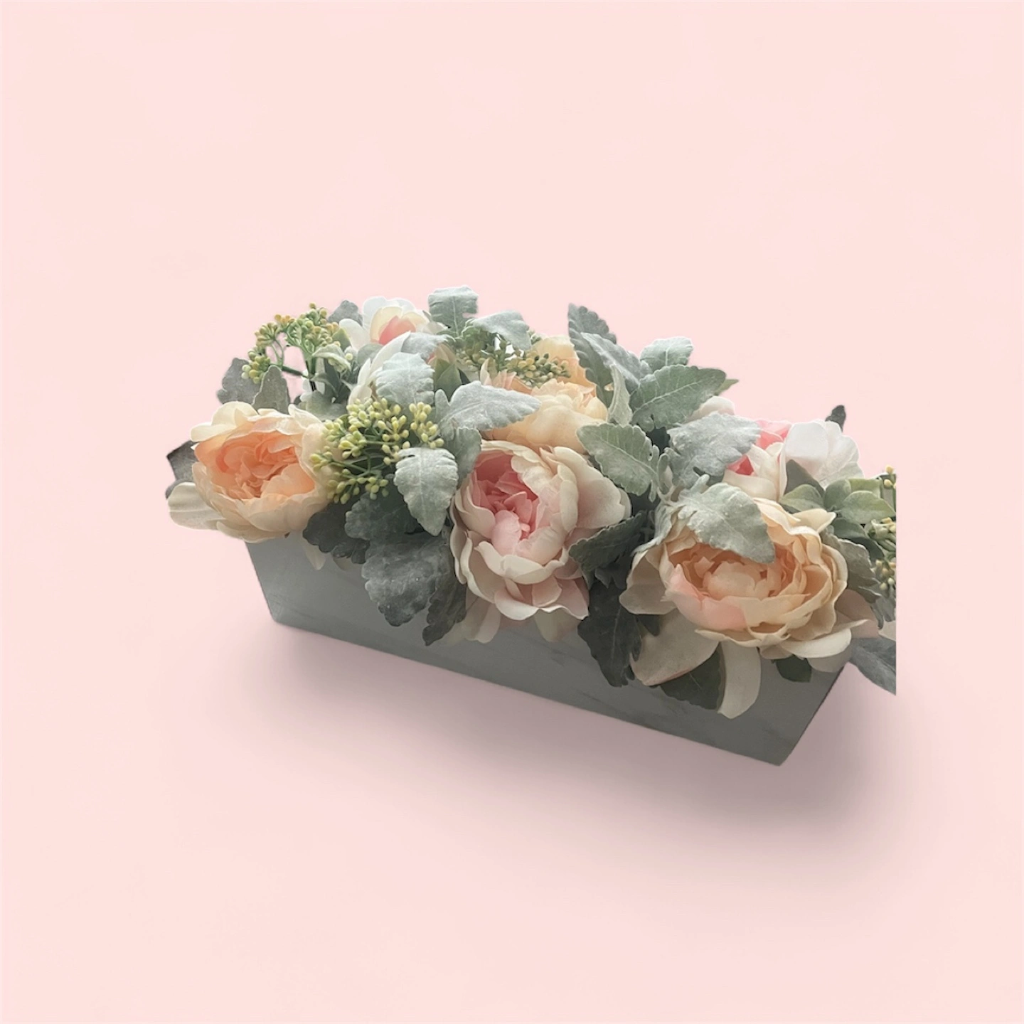 Selling a beautiful floral arrangement. It would make a lovely centrepiece for any table or room. The flowers are a mix of peach and pink with dusty miller foliage in a rectangular planter box. It's in great condition!
