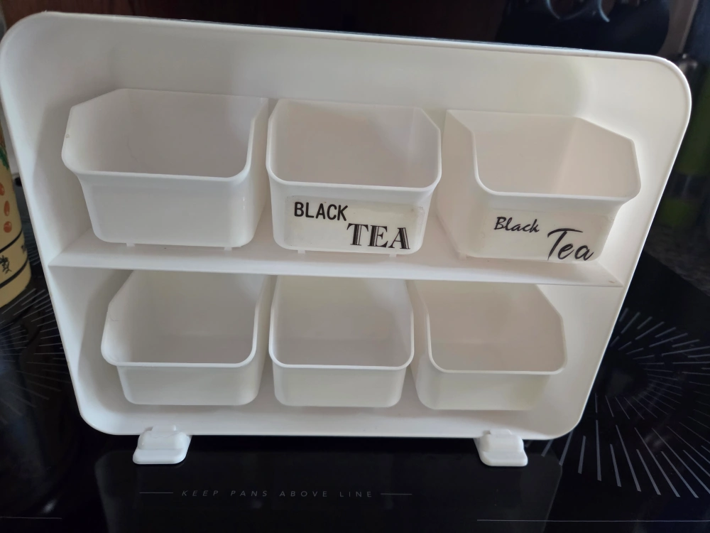 Selling a cute white tea organizer! It has six compartments, perfect for storing different types of tea or other small items. Great for keeping your kitchen or pantry tidy and organized. $5.00 Located in Hagersville Intersection is King St West and Porter Street
