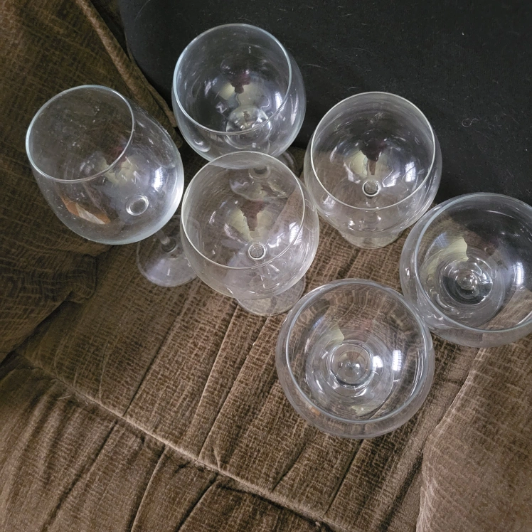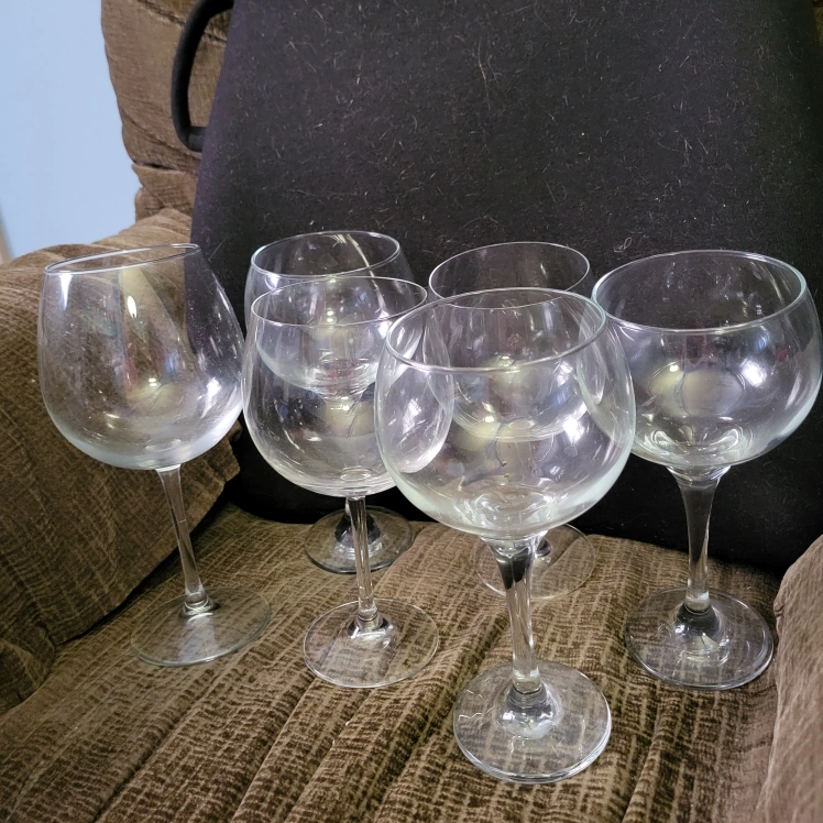 Selling a set of 6 wine glasses. They're in great condition and ready for your next dinner party or cozy night in! Perfect for red, white, or rosé, these glasses will add a touch of elegance to any occasion holds 24 oz, 9 inch tall, 3 inch dia. bowl 4 inch high