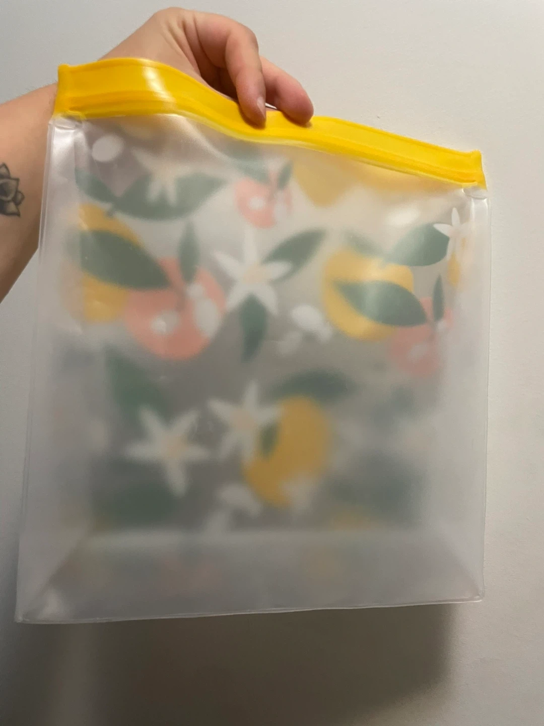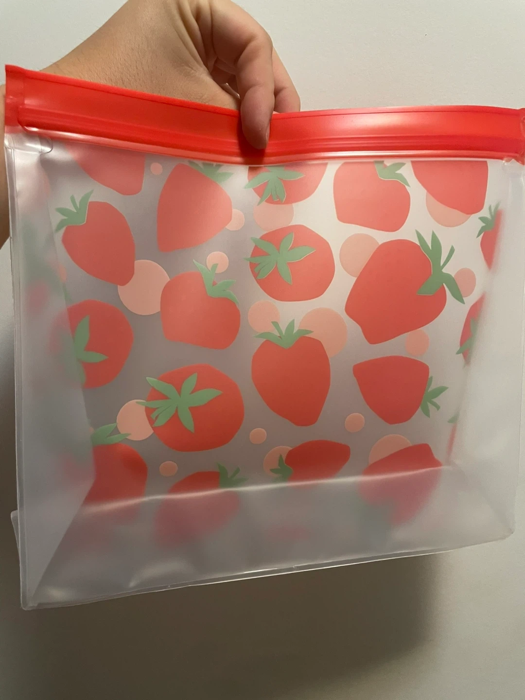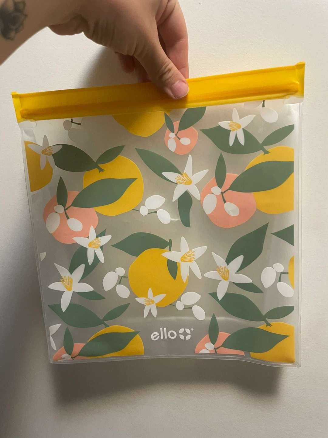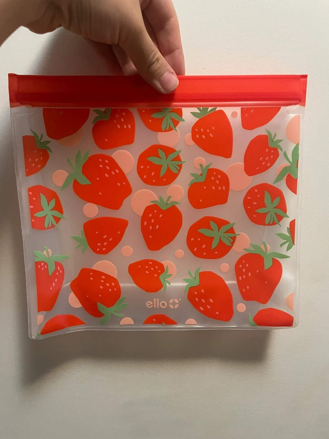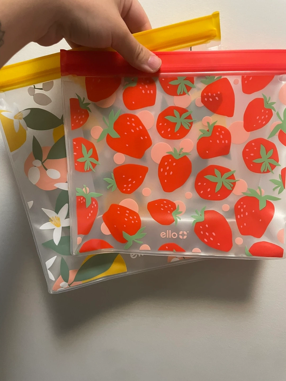 Keep your snacks fresh with these Ello reusable storage bags! One features a cute strawberry design with a red zipper, and the other has a lovely lemon pattern with a yellow zipper Standing design