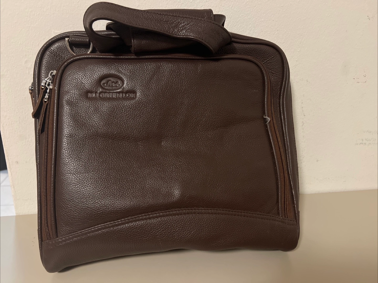 Selling a brown leather bag from Mat Green Lon. It's in good condition and perfect for everyday use! It Can carry your laptop and essentials, Has a zipper, handle and cross body strap.