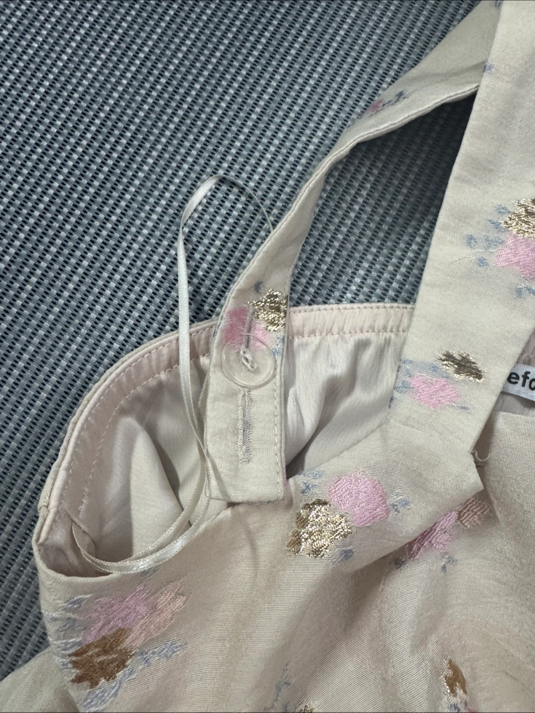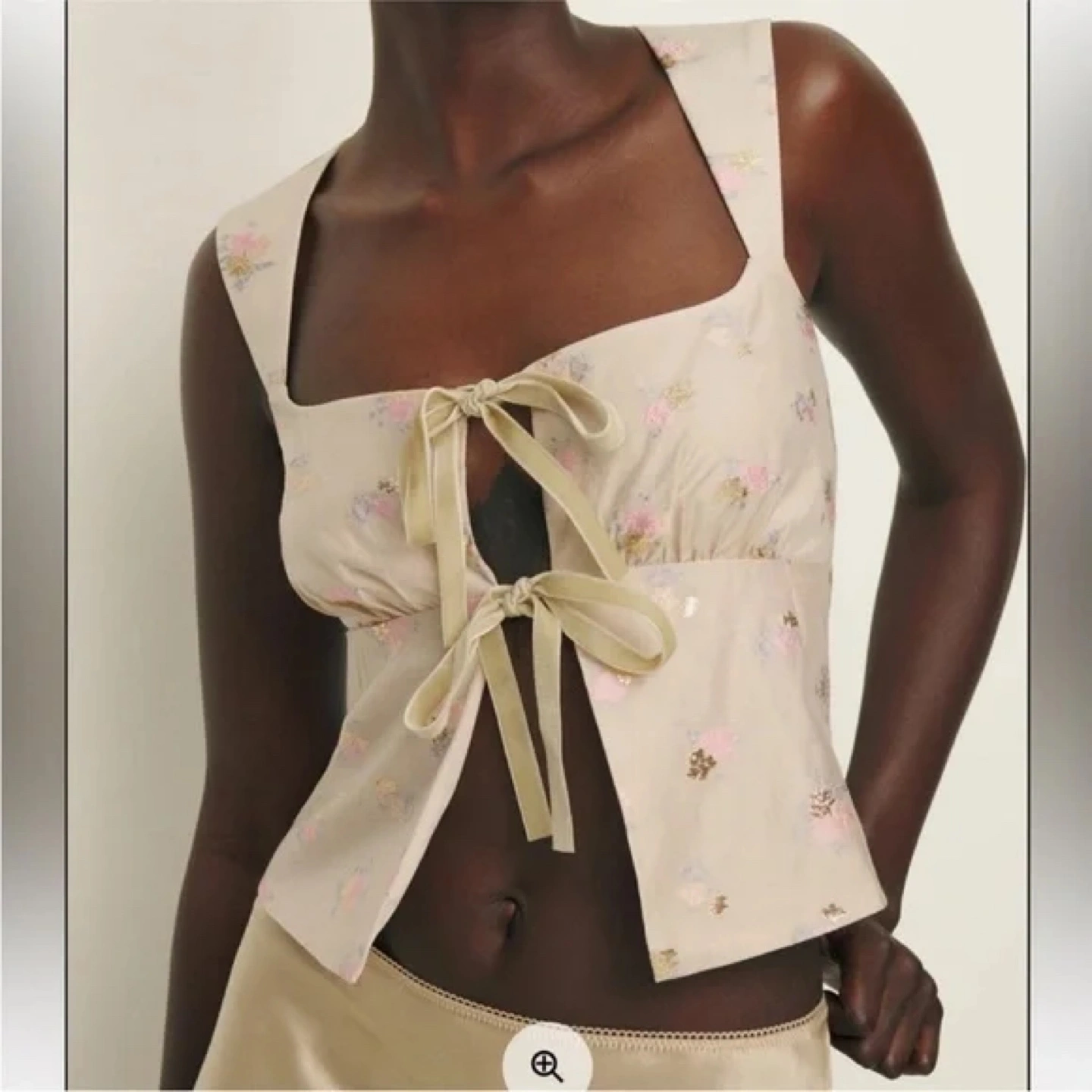 Beige-peach coloured Reformation tank top with velvet front ties and wide top straps that cross at the back and have adjustable buttons. In good condition. Worn a few times and washed+hang dried. Embroidered flower designs including some gold-coloured metallic threads. The velvet is a bit darker than in the first pic, due to wear. Has lots of wear left in it, just too small for me now.