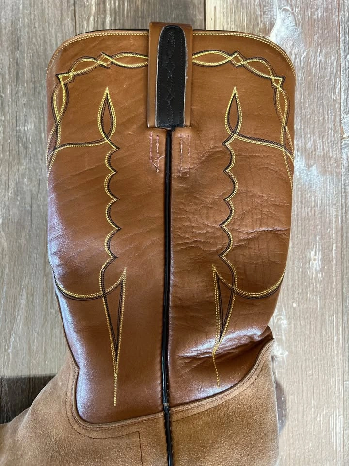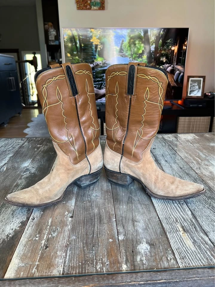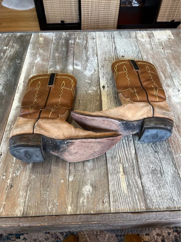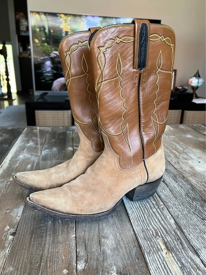 These are a pair of Tony Lama Women’s cowboy boots, size 8, crafted with high-quality leather and suede. These boots have that classic western style, perfect for adding a touch of rugged flair to your wardrobe. Because they've been worn, they've picked up some character and charm along the way, making them truly one-of-a-kind. Specifics: * Brand: Tony Lama * Size: 8 * Material: Leather and Suede * Style: Cowboy