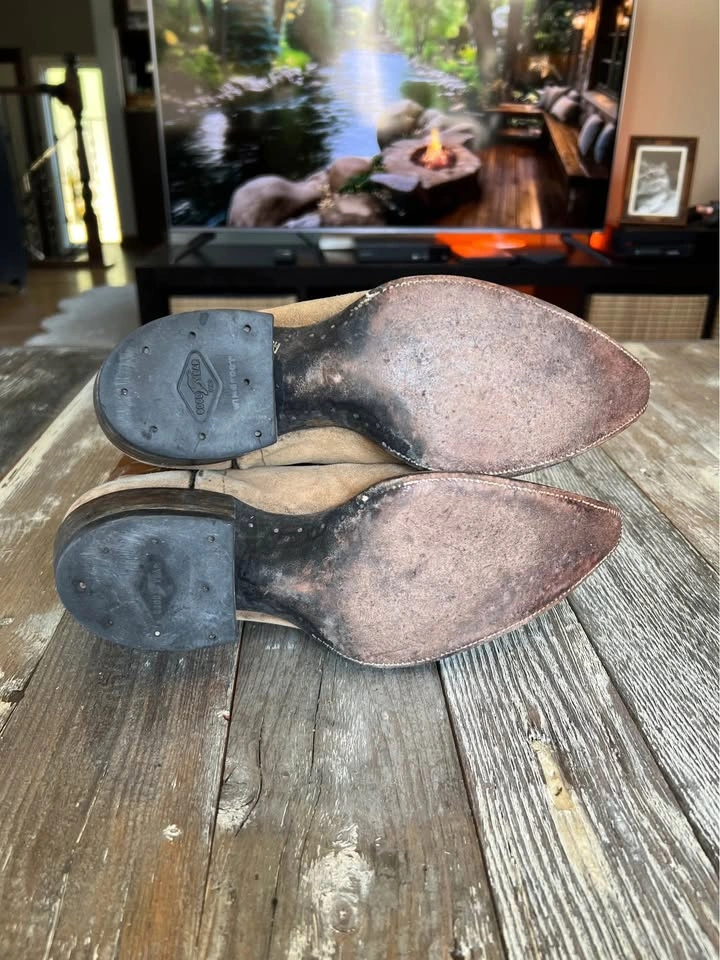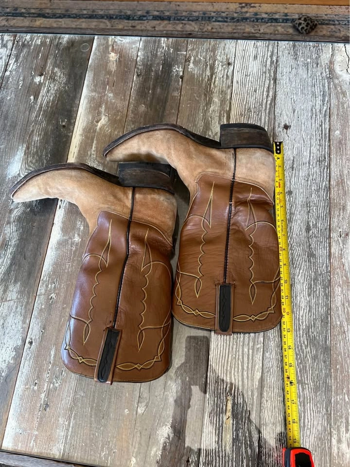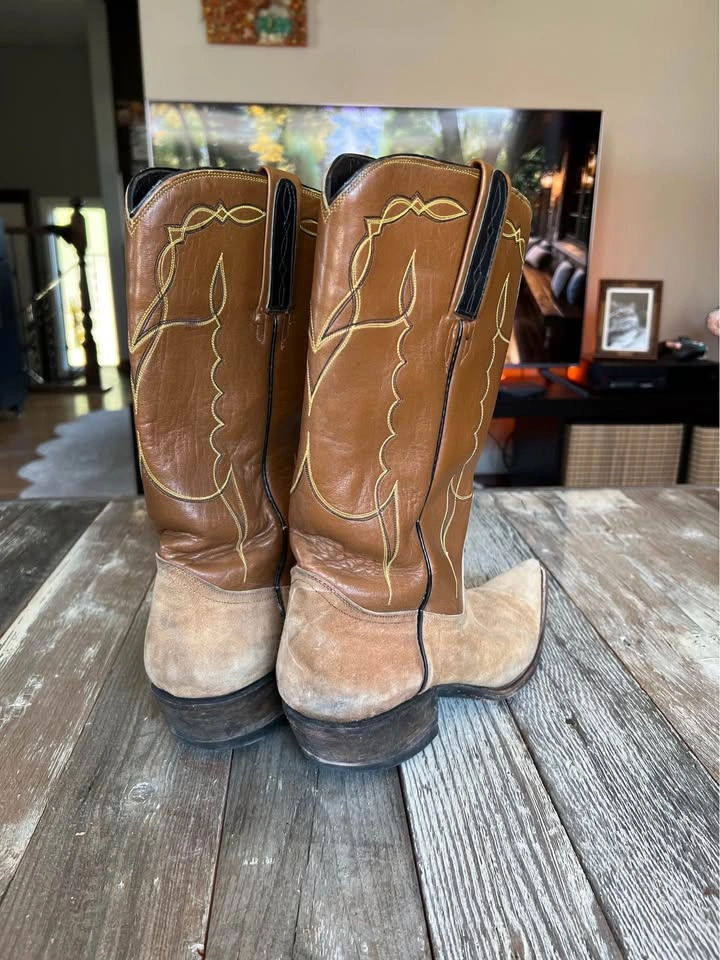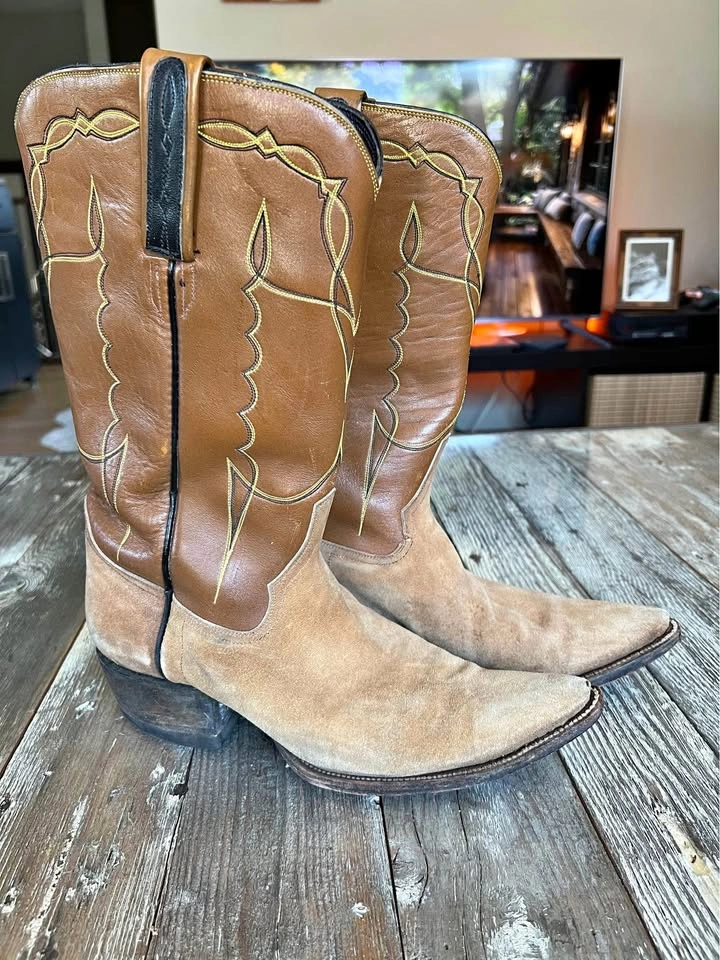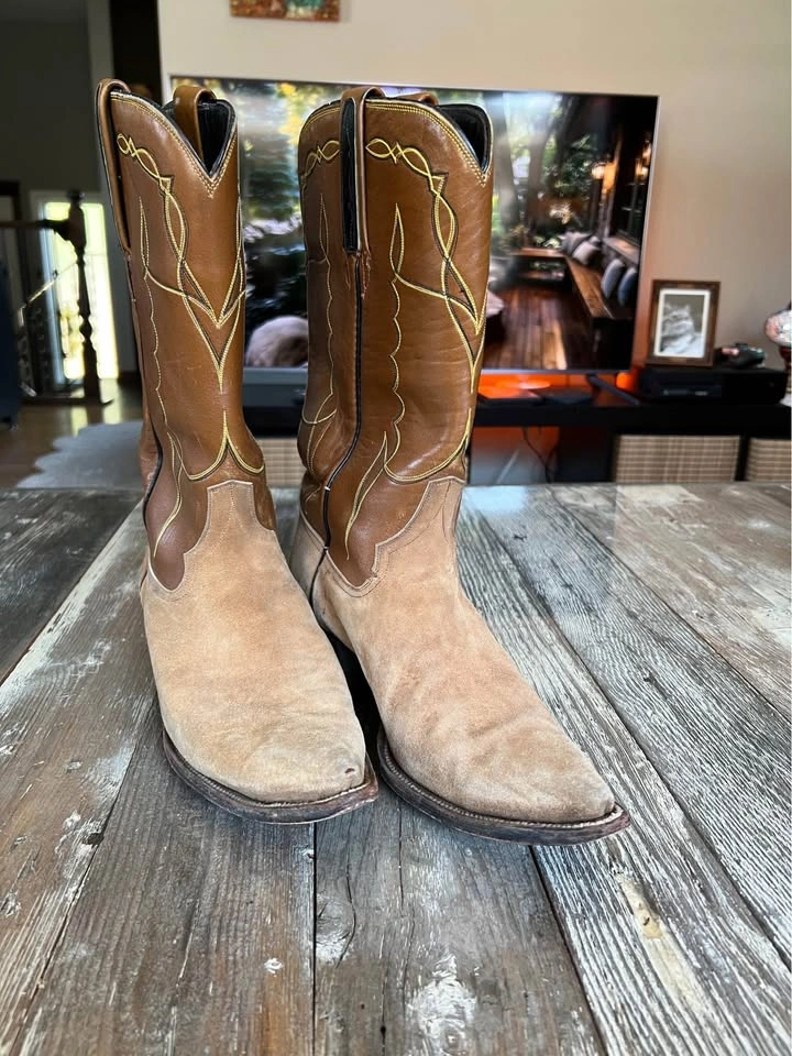 These are a pair of Tony Lama Women’s cowboy boots, size 8, crafted with high-quality leather and suede. These boots have that classic western style, perfect for adding a touch of rugged flair to your wardrobe. Because they've been worn, they've picked up some character and charm along the way, making them truly one-of-a-kind. Specifics: * Brand: Tony Lama * Size: 8 * Material: Leather and Suede * Style: Cowboy