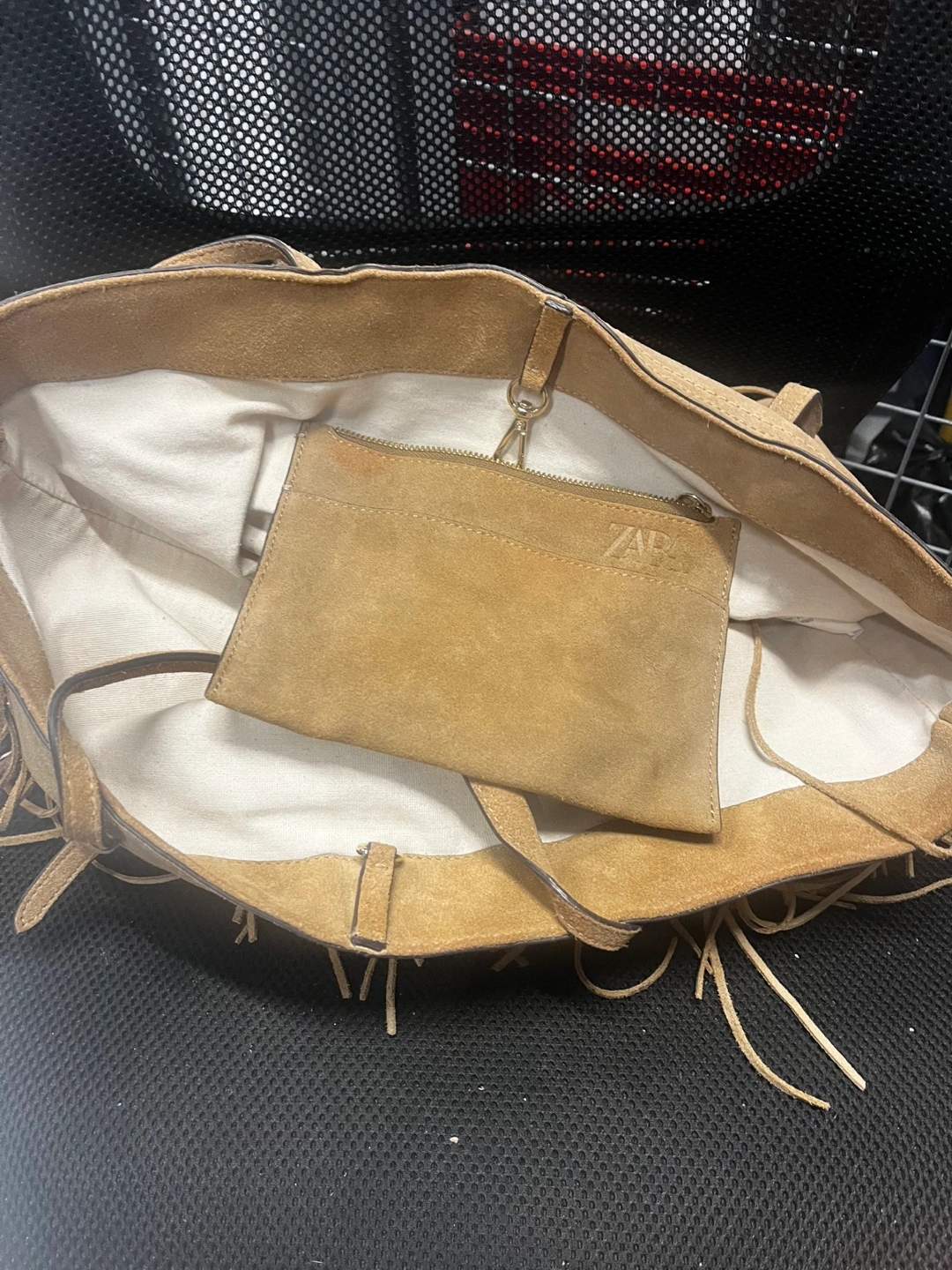 Selling a tan suede tote bag from Zara! It features a fringe detail and comes with a small zippered pouch inside. It's a stylish and roomy bag, perfect for everyday use