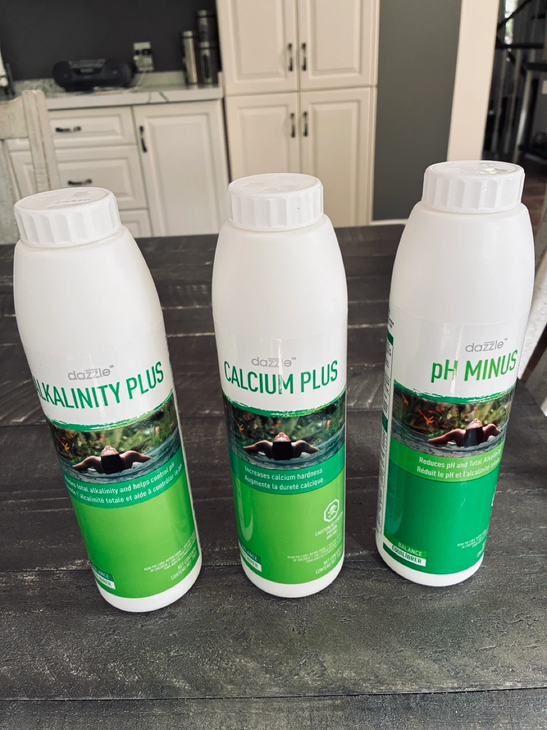 Selling three bottles of Dazzle pool chemicals: Alkalinity Plus, Calcium Plus, and pH Minus. These help maintain the balance of your pool water. Get ready for summer! Take all for $25. 950 grams each