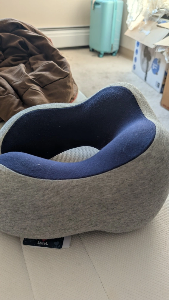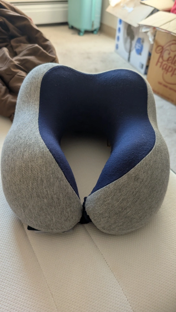 Here's a comfy travel neck pillow in great condition! It's perfect for long trips to keep you supported and relaxed. The pillow is grey on the outside with a navy blue interior. It’s been gently used and is ready for a new home!