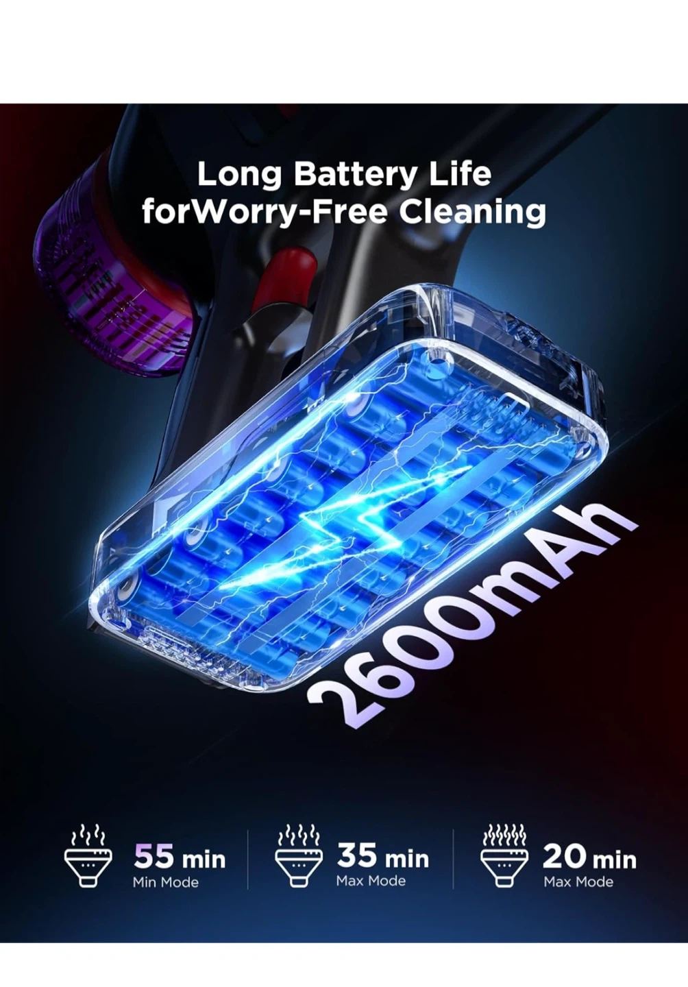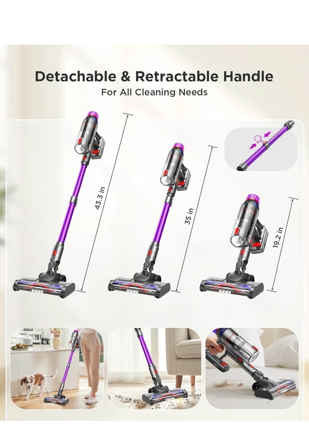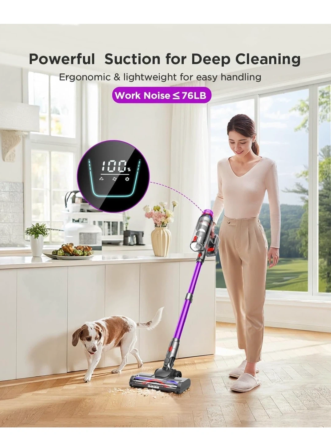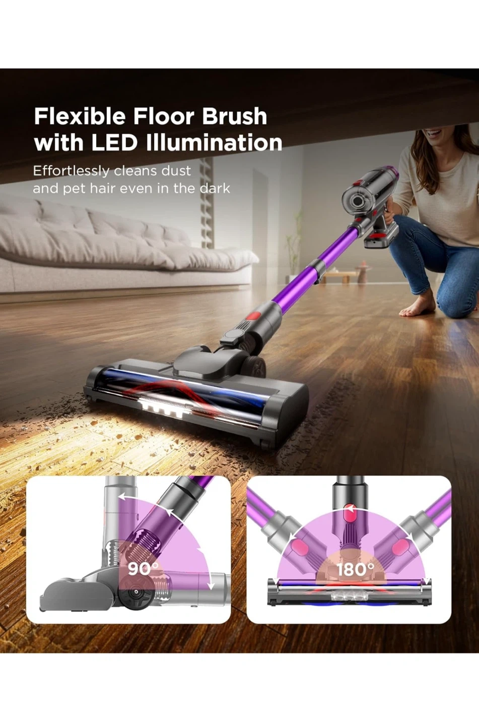 This cordless stick vacuum cleaner is designed for deep cleaning on all floor types. It's lightweight and easy to handle, making cleaning a breeze. Features include: - Flexible floor brush with LED illumination for cleaning in dark areas - Powerful suction - Detachable & retractable handle for all cleaning needs - Low work noise (≤ 76dB) - Save time with hair tangle hassles