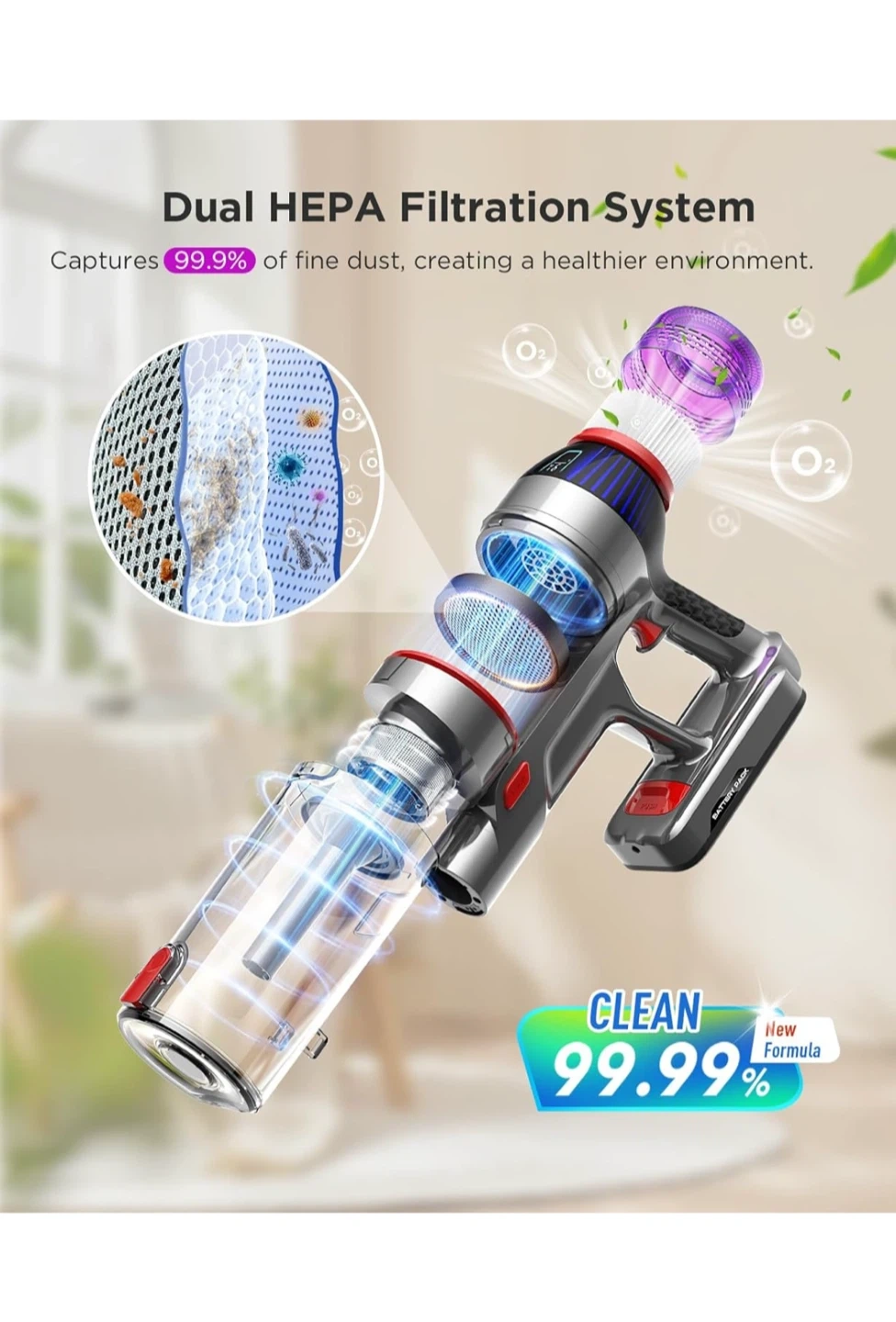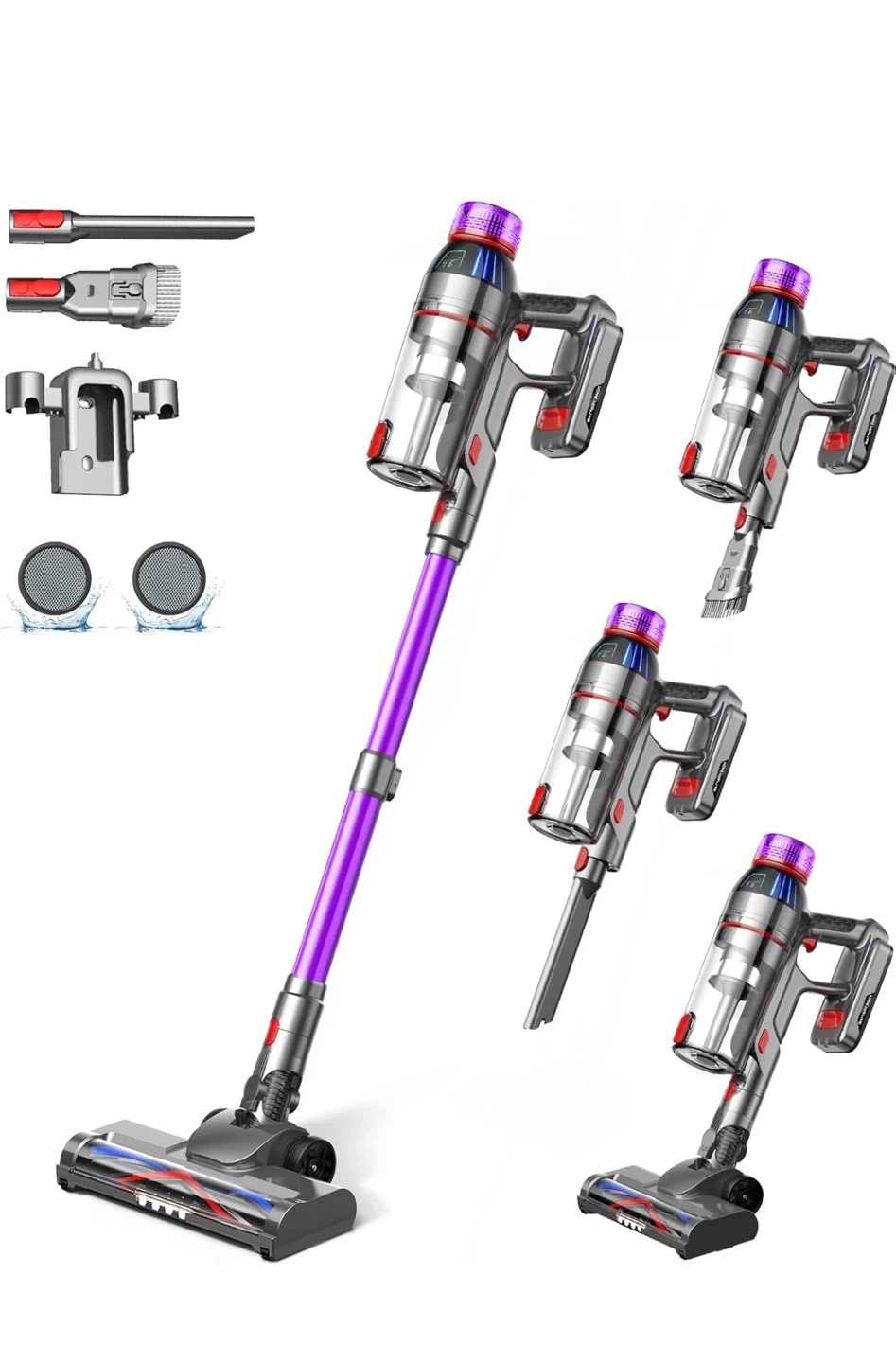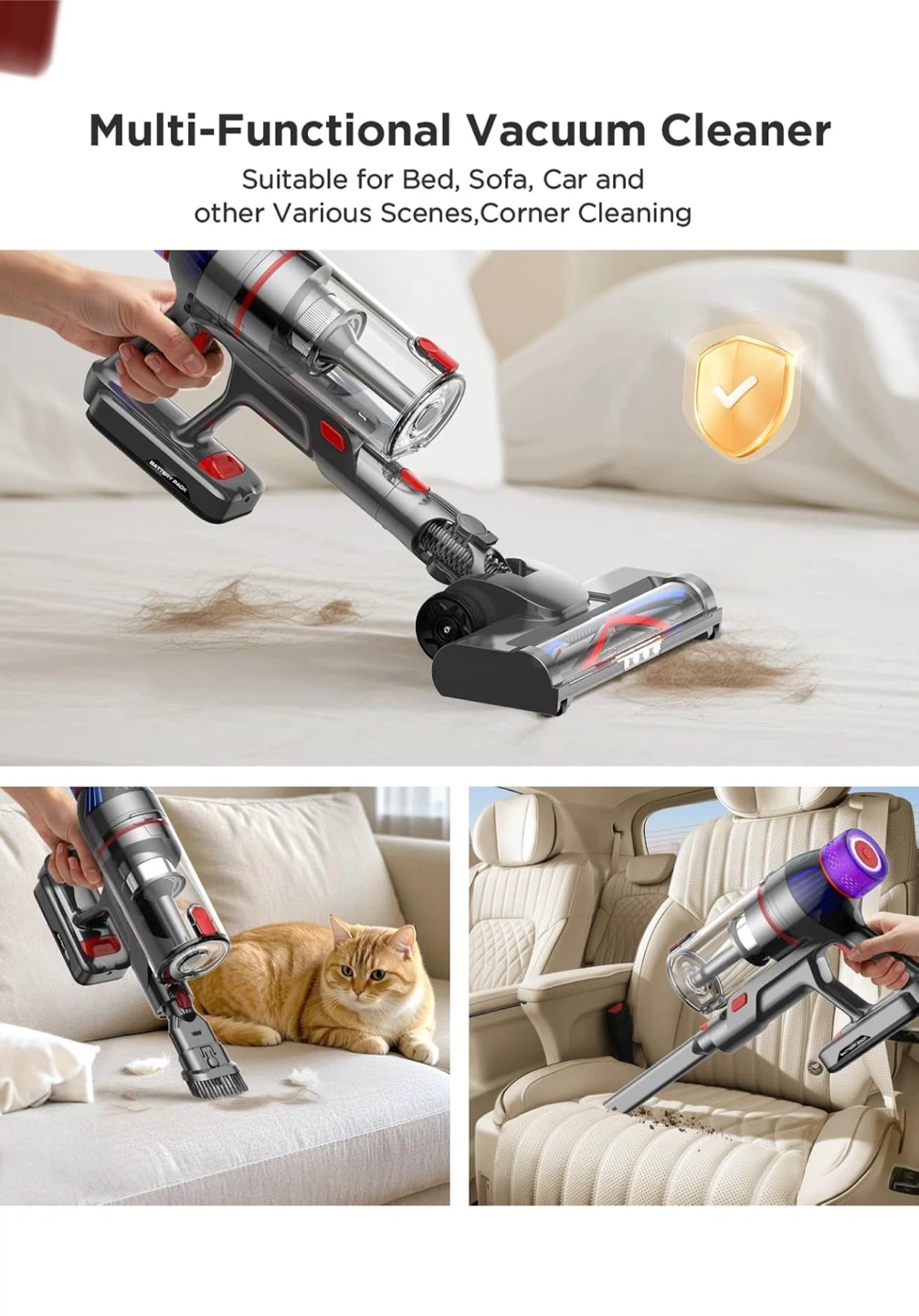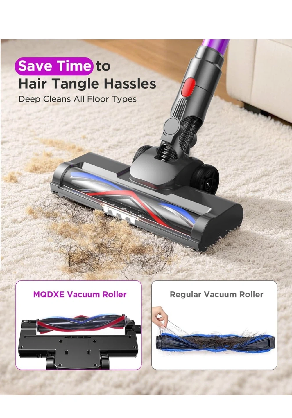 This cordless stick vacuum cleaner is designed for deep cleaning on all floor types. It's lightweight and easy to handle, making cleaning a breeze. Features include: - Flexible floor brush with LED illumination for cleaning in dark areas - Powerful suction - Detachable & retractable handle for all cleaning needs - Low work noise (≤ 76dB) - Save time with hair tangle hassles